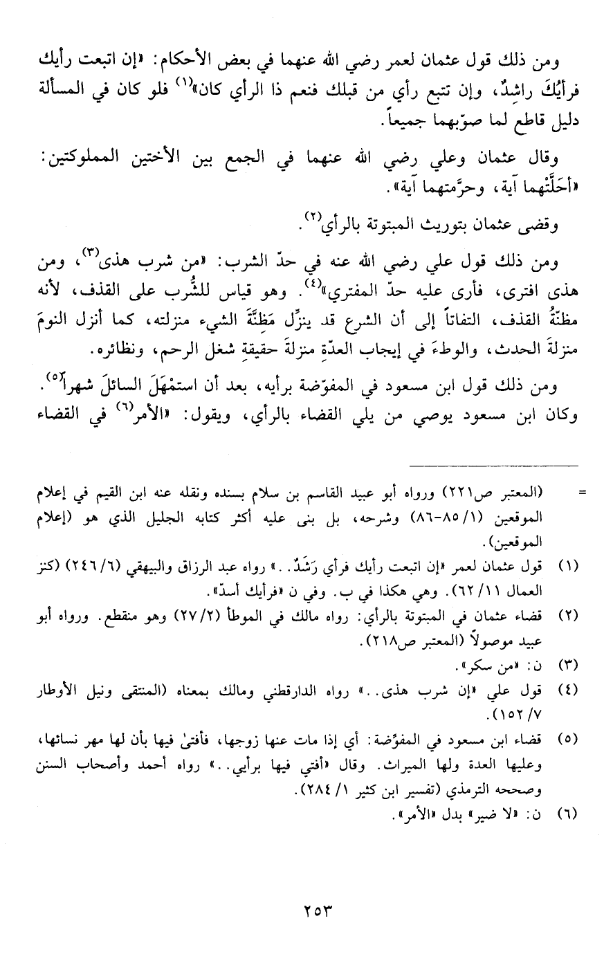 ومن ذلك قول عثمان لعمر رضي الله عنهما في بعض الأحكام إن اتبعت رأيك فرأيك أسد وإن تتبع رأي من قبلك فنعم الرأي كان فلو كان في المسألة دليل قاطع لما صوبهما جمعا