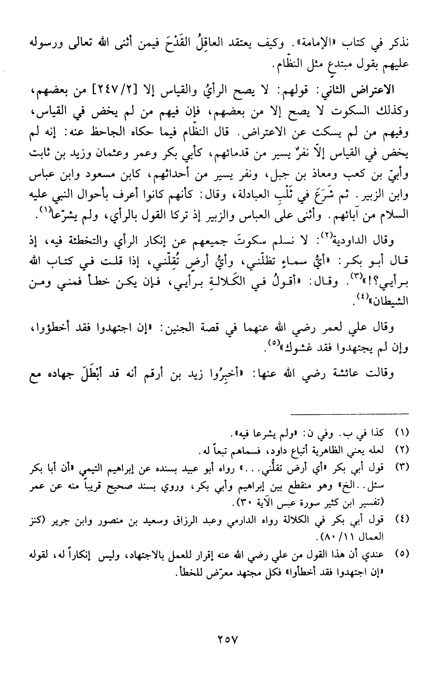 الاعتراض الثاني : قولهم لا يصح الرأي والقياس إلا من بعضهم وكذلك السكوت لا يصح إلا من بعضهم فإن فيهم من لم يخض في القياس وفيهم من لم يسكت عن الاعتراض قال النظام فيما حكاه الجاحظ عنه إنه لم يخض في القياس إلا نفر يسير من قدمائهم كأبي بكر وعمر وعثمان وزيد بن ثابت وأبي بن كعب ومعاذ بن جبل ونفر يسير من أحداثهم كابن مسعود وابن عباس وابن الزبير ثم شرع في ثلب العبادلة وقال كأنهم كانوا أعرف بأحوال النبي عليه السلام من آبائهم وأثنى على العباس والزبير إذ تركا القول بالرأي ولم يشرعا