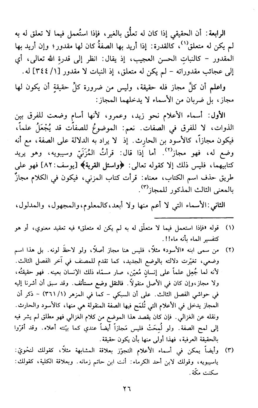 الأول : أسماء الأعلام نحو زيد وعمرو لأنها أسام وضعت للفرق بين الذوات لا للفرق في الصفات نعم الموضوع للصفات قد يجعل علما فيكون مجازا كالأسود بن الحرث إذ لا يراد به الدلالة على الصفة مع أنه وضع له فهو مجاز أما إذا قال قرأت المزني وسيبويه وهو يريد كتابيهما فليس ذلك إلا كقوله تعالى {وَاسْأَلِ الْقَرْيَةَ } [يوسف: من الآية82] فهو على طريق حذف اسم الكتاب معناه قرأت كتاب المزني فيكون في الكلام مجاز بالمعنى الثالث المذكور للمجاز