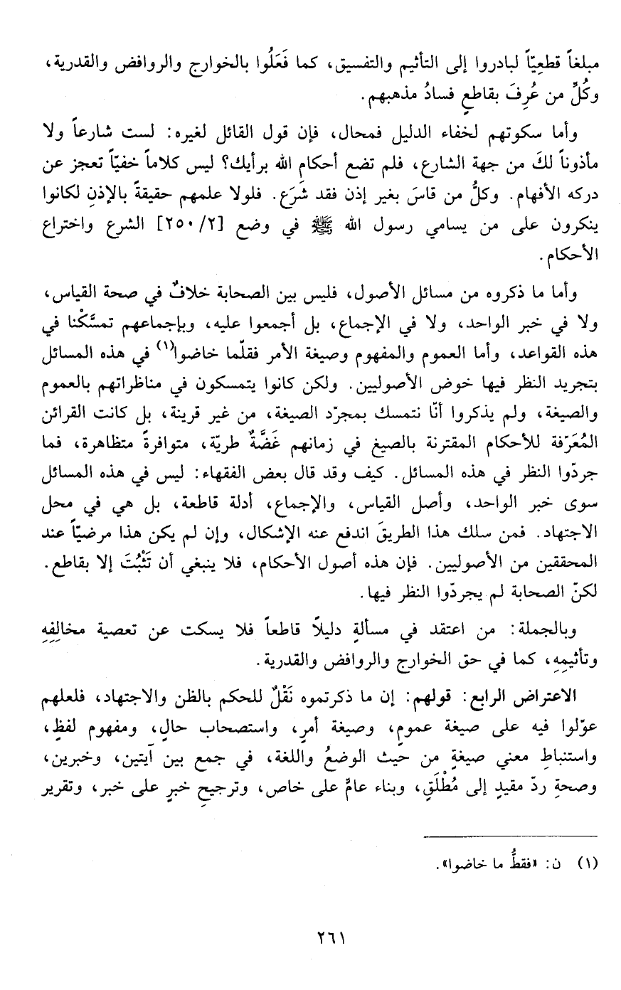 وأما ما ذكروه من مسائل الأصول فليس بين الصحابة خلاف في صحة القياس ولا في خبر الواحد ولا في الإجماع بل أجمعوا عليه وبإجماعهم تمسكنا في هذه القواعد وأما العموم والمفهوم وصيغة الأمر فقلما خاضوا في هذه المسائل بتجريد النظر فيما خوض الأصوليين ولكن كانوا يتمسكون في مناراتهم بالعموم والصيغة ولم يذكروا أنا نتمسك بمجرد الصيغة من غير قرينة بل كانت القرائن المعرفة للأحكام المتقرنة بالصيغ في زمانهم غضة طرية متوافرة متظاهرة فما جردوا النظر في هذه المسائل كيف وقد قال بعض الفقهاء ليس في هذه المسائل سوى خبر الواحد وأصل القياس والإجماع أدلة قاطعة بل هي في محل الاجتهاد فمن سلك هذا الطريق اندفع عنه الإشكال وإن لم يكن هذا مرضيا عند المحققين من الأصوليين فإن هذه أصول الأحكام فلا ينبغي أن تثبت إلا بقاطع لكن الصحابة لم يجردوا النظر فيها