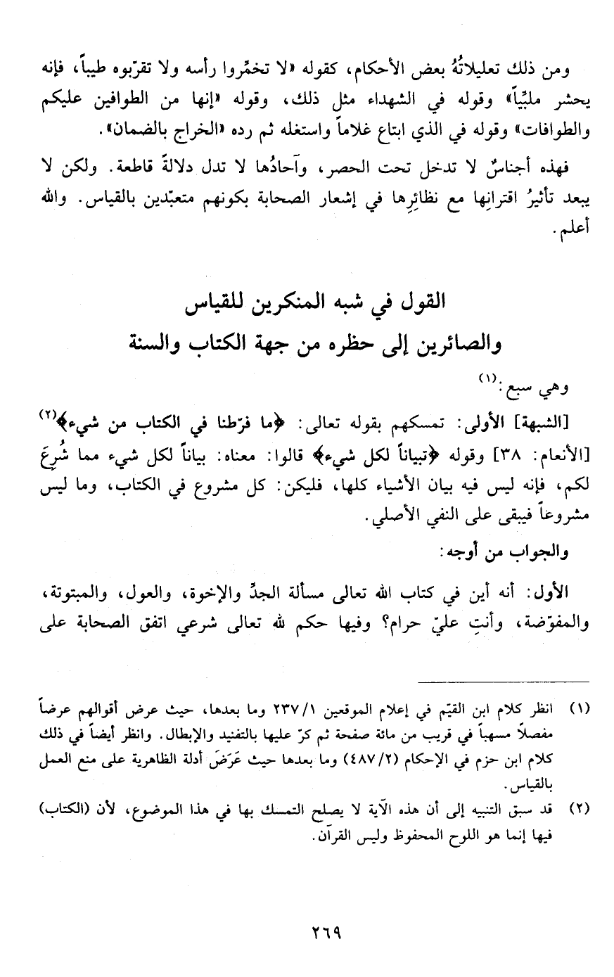 الأولى:تمسكهم بقوله تعالى {مَا فَرَّطْنَا فِي الْكِتَابِ مِنْ شَيْءٍ} [الأنعام: من الآية38]وقوله {تِبْيَاناً لِكُلِّ شَيْءٍ} [النحل: من الآية89]قالوا معناه بيانا لكل شيء مما شرع لكم فإنه ليس فيه بيان الأشياء كلها فليكن كل مشروع في الكتاب وما ليس مشروعا فيبقى على النفي الأصلي
