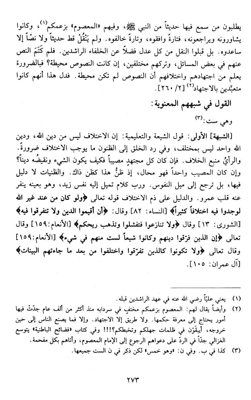 الأولى: قول الشيعة والتعليمية إن الاختلاف ليس من دين الله ودين الله واحد ليس بمختلف وفي رد الخلق إلى الظنون ما يوجب الاختلاف ضرورة الرأي منبع الخلاف فإن كان كل مجتهد مصيبا فكيف يكون الشيء ونقيضه دينا وإن كان المصيب واحدا فهو محال إذ ظن هذا كظن ذاك والطنيات لا دليل فيها بل ترجع إلى ميل النفوس ورب كلام تميل إليه نفس زيد وهو بعينه ينفر عنه قلب عمرو والدليل على ذم الاختلاف قوله تعالى {وَلَوْ كَانَ مِنْ عِنْدِ غَيْرِ اللَّهِ لَوَجَدُوا فِيهِ اخْتِلافاً كَثِيراً} [النساء: من الآية82]وقال {أَنْ أَقِيمُوا الدِّينَ وَلا تَتَفَرَّقُوا فِيهِ}[ الشورى: من الآية13]وقال {وَلا تَنَازَعُوا فَتَفْشَلُوا وَتَذْهَبَ رِيحُكُمْ } [لأنفال: من الآية46]وقال تعالى {إِنَّ الَّذِينَ فَرَّقُوا دِينَهُمْ وَكَانُوا شِيَعاً لَسْتَ مِنْهُمْ فِي شَيْءٍ } [الأنعام: من الآية159]وقال تعالى {وَلا تَكُونُوا كَالَّذِينَ تَفَرَّقُوا وَاخْتَلَفُوا مِنْ بَعْدِ مَا جَاءَهُمُ الْبَيِّنَاتُ} [آل عمران: من الآية105]