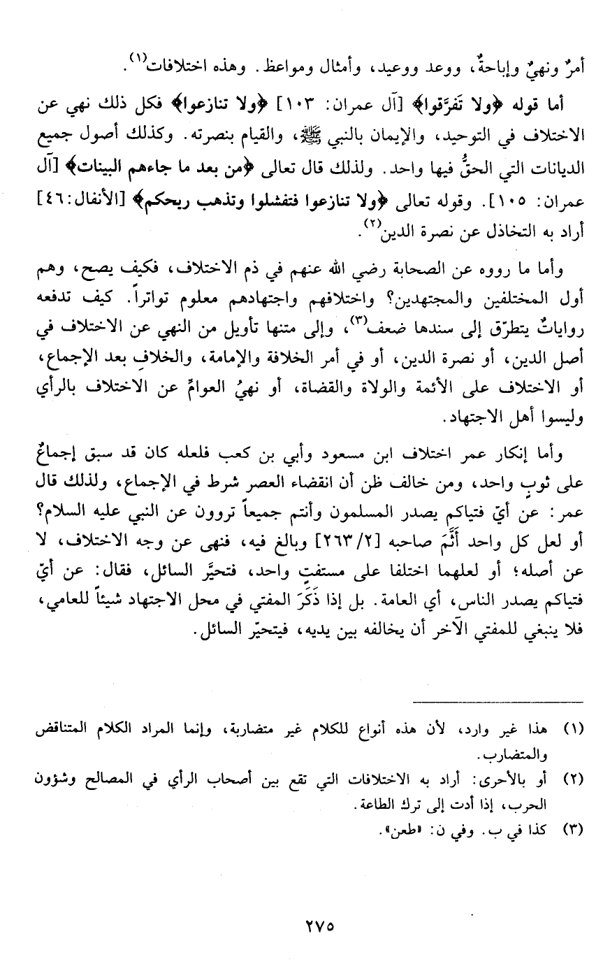 وأما ما رووه عن الصحابة رضي الله عنهم في ذم الاختلاف فكيف يصح وهم أول المختلفين والمجتهدين؟ واختلافهم واجتهادهم معلوم تواترا كيف تدفعها روايات يتطرق إلى سندها ضعف وإلى متنها تأويل من النهي عن الاختلاف في أصل الدين أو نصرة الدين أو في أمر الخلافة والإمامة والخلاف بعد الإجماع أو الاختلاف على الأئمة والولاة والقضاة أو نهي العوام عن الاختلاف بالرأي وليسوا أهل الاجتهاد
