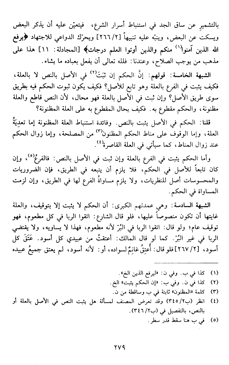 الخامسة:قولهم أن الحكم يثبت في الأصل بالنص لا بالعلة فكيف يثبت في الفرع بالعلة وهو تابع للأصل .؟فكيف يكون ثبوت الحكم فيه بطرق سوى طريق الأمل وأن ثبت في الأصل ؟بالعلة فهو محال لأن النص قاطع والعلة مظنونة والحكم مقطوع به فكيف يحال المقطوع به على العلة المظنونة ؟