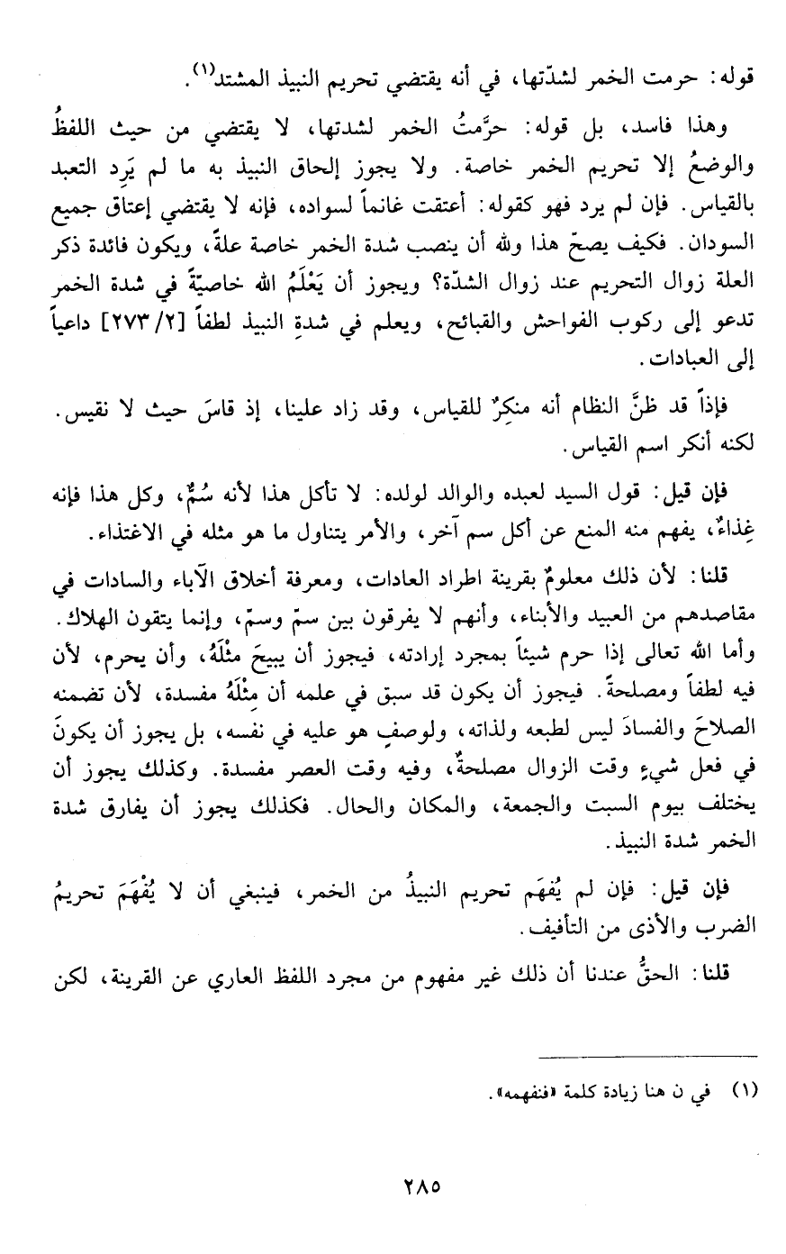 وهذا فاسد لأن قوله حرمت الخمر لشدتها لا يقتضي من حيث اللفظ والوضع إلا تحريم الخمر خاصة ولا يجوز إلحاق النبيذ ما لم يرد التعبد بالقياس وإن لم يرد فهو كقوله أعتقت غانما لسواده فإنه لا يقتضي إعتاق جميع السودان فكيف يصح هذا ولله أن ينصب شدة الخمر خاصة علة ويكون فائدة ذكر العلة زوال التحريم عند زوال الشدة ويجوز أن يعلم الله خاصية في شدة الخمر تدعو إلى ركوب القبائح ويعلم في شدة النبيذ لطفا داعيا إلى العبادات