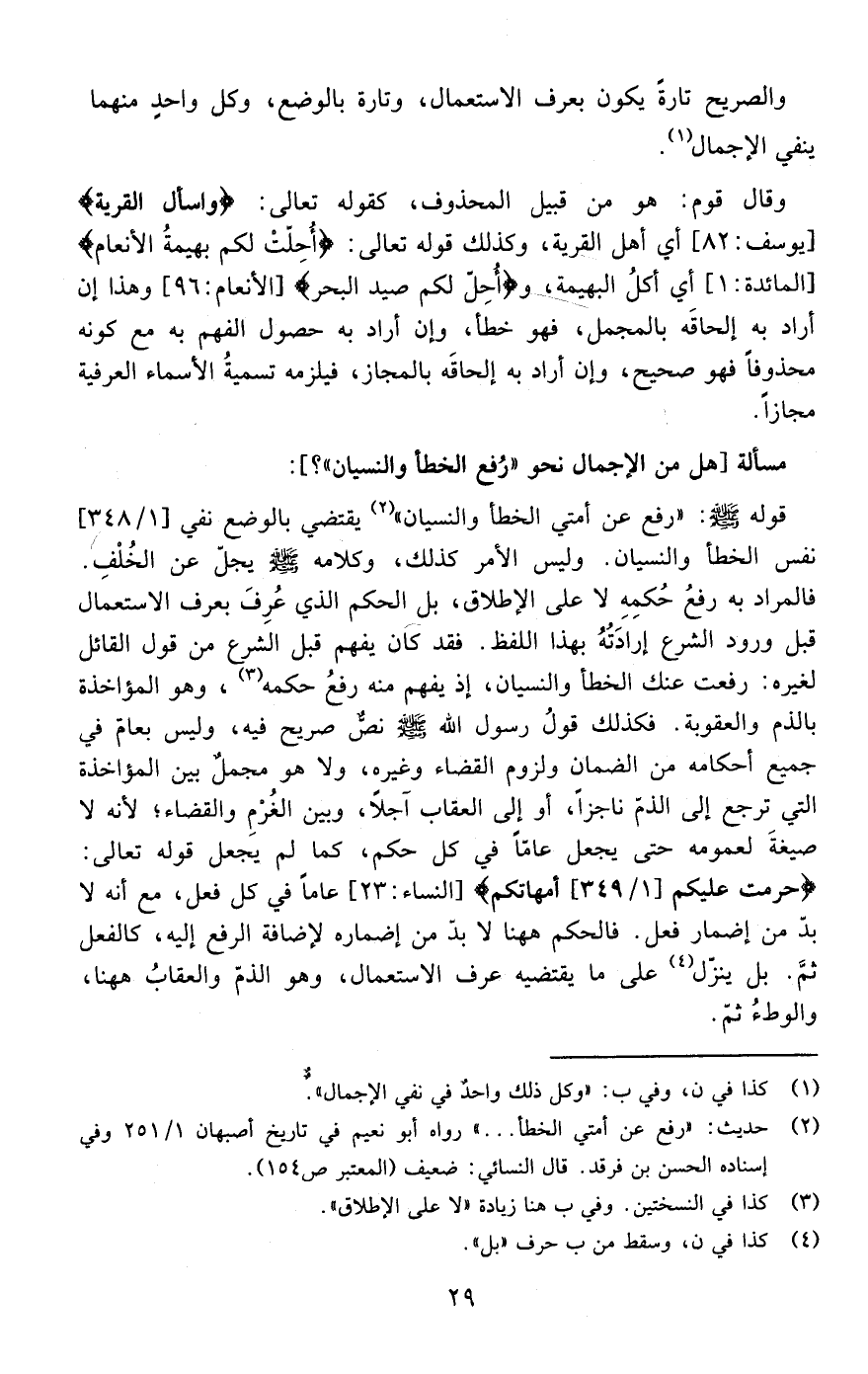 قوله صلى الله عليه وسلم : "رفع عن أمتي الخطأ والنسيان " يقتضي بالوضع نفي نفس الخطأ والنسيان وليس كذلك وكلامه صلى الله عليه وسلم يجل عن الخلف فالمراد به رفع حكمه لا على الإطلاق بل الحكم الذي عرف بعرف الاستعمال قبل ورود الشرع إرادته بهذا اللفظ فقد كان يفهم قبل الشرع من قول القائل لغيره رفعت عنك الخطأ والنسيان إذ يفهم منه رفع حكمه لا على الإطلاق وهو المؤاخذة بالذم والعقوبة فكذلك قول رسول الله صلى الله عليه وسلم نص صريح فيه وليس بعام في جميع أحكامه من الضمان ولزوم القضاء وغيره ولا هو مجمل بين المؤاخذة التي ترجع إلى الذم ناجزا أو إلى العقاب آجلا وبين الغرم والقضاء لأنه لا صيغة لعمومه حتى يجعل عاما في كل حكم كما لم يجعل قوله تعالى: { حُرِّمَتْ عَلَيْكُمْ أُمَّهَاتُكُمْ } [النساء: من الآية23]عاما في كل فعل مع أنه لا بد من إضمار فعل فالحكم هاهنا لا بد من إضماره لإضافة الرفع إليه كالفعل ثم ينزل على ما يقتضيه عرف الاستعمال وهو الذم والعقاب هاهنا والوطء ثم