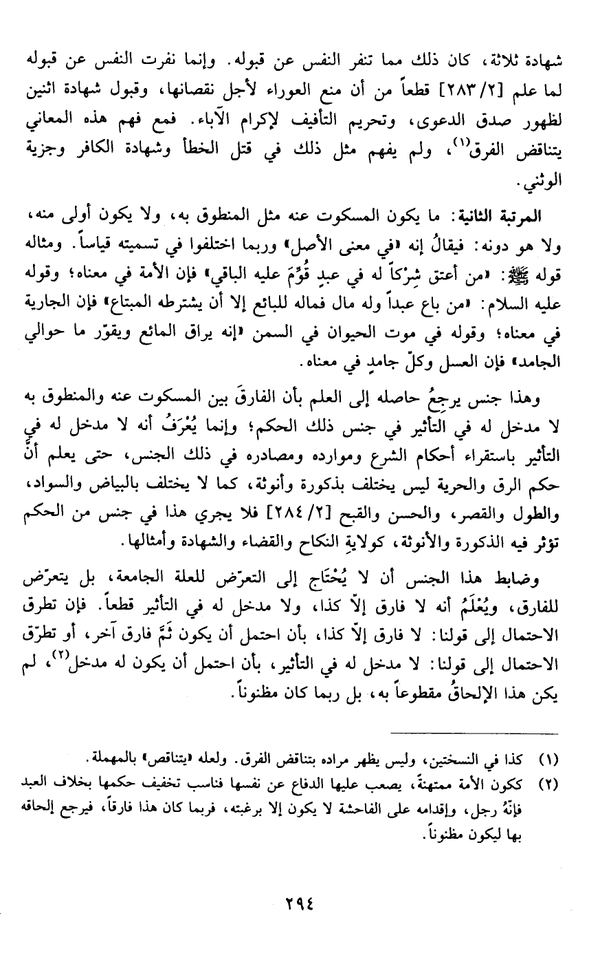 وهذا جنس يرجع حاصله إلى العلم بأن الفارق بين المسكوت عنه والمنطوق به لا مدخل له في التأثير في جنس ذلك الحكم وإنما يعرف أنه لا مدخل له في التأثير باستقراء أحكام الشرع وموارده ومصادره في ذلك الجنس حتى يعلم أن حكم الرق والحرية ليس يختلف بذكورة وأنوثة كما لا يختلف بالبياض والسواد والطول والقصر والحسن والقبح فلا يجري هذا في جنس من الحكم تؤثر الذكورة فيه والأنوثة كولاية النكاح والقضاء والشهادة وأمثالها