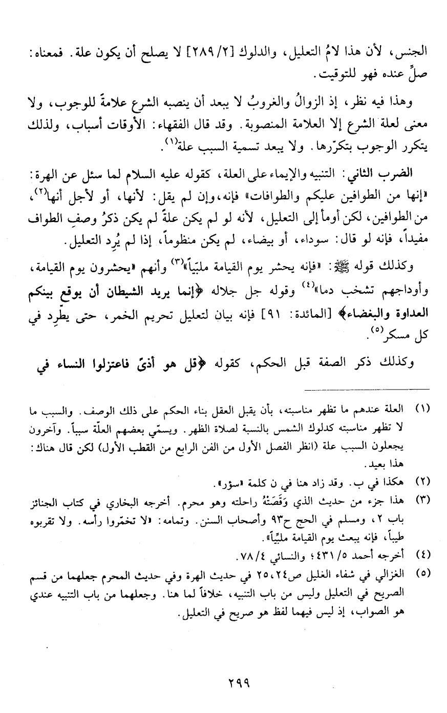الضرب الثاني: التنبيه والإيماء على العلة كقوله عليه السلام لما سئل عن الهرة إنها من الطوافين عليكم أو الطوافات فإنه وإن لم يقل لأنها أو لأجل أنها من الطوافين لكن أومأ إلى التعليل لأنه لو لم يكن علة لم يكن ذكر وصف الطواف مفيدا فإنه لو قال إنها سوداء أو بيضاء لم يكن منظوما إذ لم يرد التعليل وكذلك قوله صلى الله عليه وسلم :"فإنه يحشر يوم القيامة ملبيا" وإنهم يحشرون وأوداجهم تشخب دما وقوله جل جلاله {إِنَّمَا يُرِيدُ الشَّيْطَانُ أَنْ يُوقِعَ بَيْنَكُمُ الْعَدَاوَةَ وَالْبَغْضَاءَ} [المائدة: من الآية91] فإنه بيان لتعليل تحريم الخمر حتى يطرد في كل مسكر