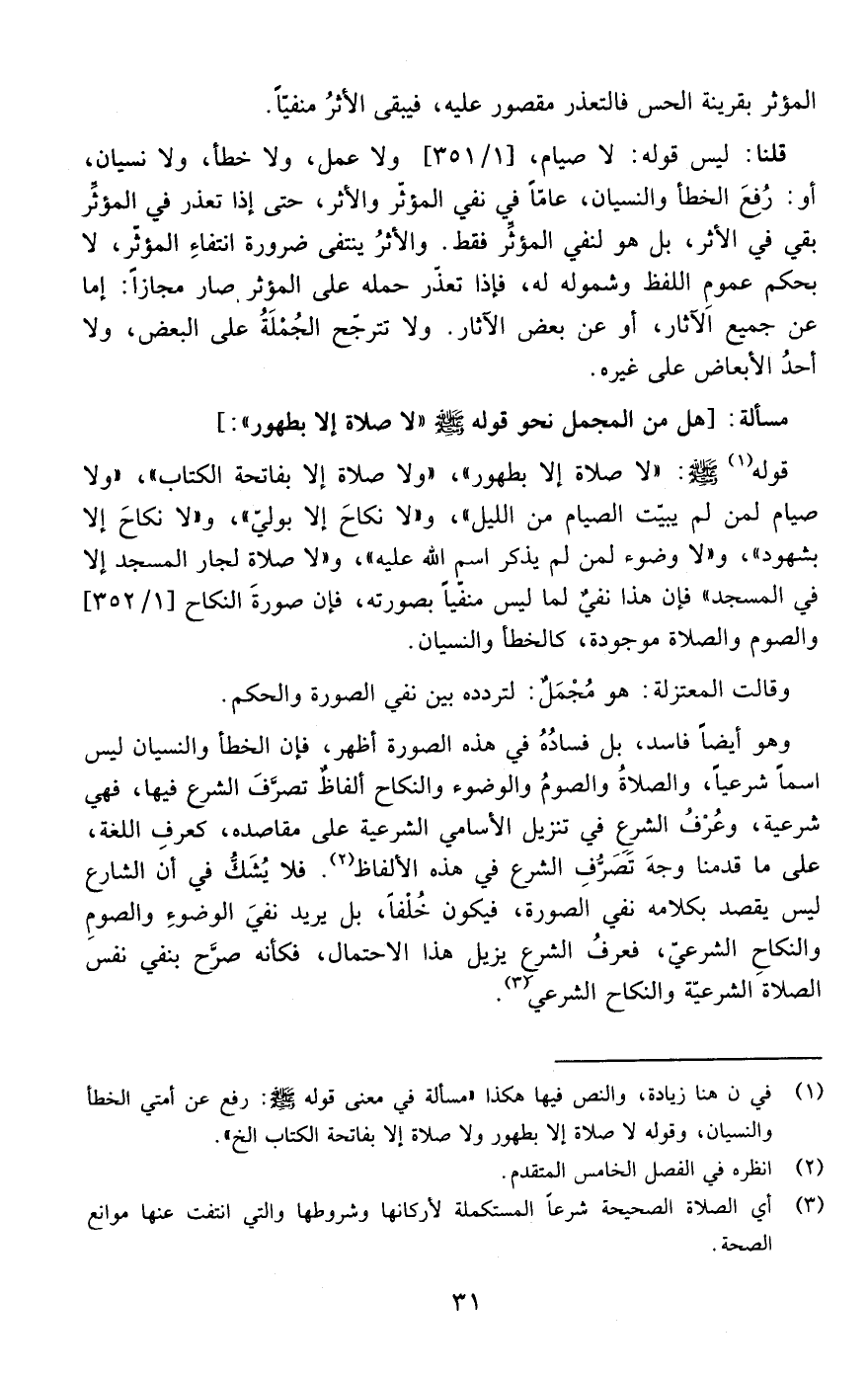 قوله صلى الله عليه وسلم "لا صلاة إلا بطهور " " ولا صلاة إلا بفاتحة الكتاب " " ولا صيام لمن لم يبيت الصيام من الليل " و" لا نكاح إلا بولي " "ولا نكاح إلا بشهود" و "لا وضوء لمن لم يذكر اسم الله عليه" و "لا صلاة لجار المسجد إلا في المسجد" فإن هذا نفي لما ليس منفيا بصورته فإن صورة النكاح والصوم والصلاة موجودة كالخطأ والنسيان
