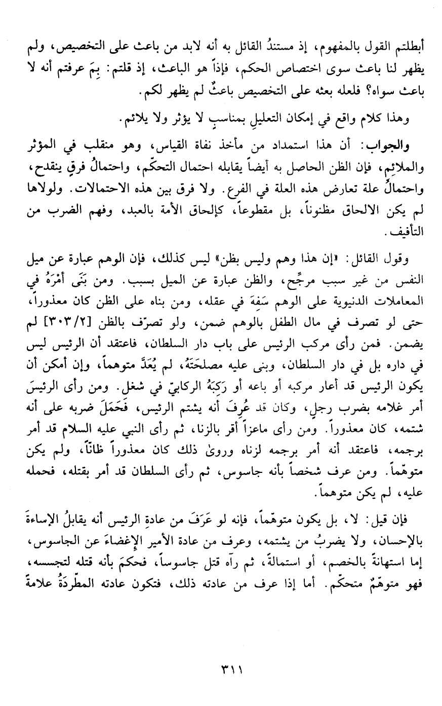 وقول القائل أن هذا وهم وليس بظن ليس كذلك فإن الوهم عبارة عن ميل النفس من غير سبب مرجح والظن عبارة عن الميل بسبب ومن بنى أمره في المعاملات الدنيوية على الوهم سفه في عقله ومن بناه على الظن كان معذورا حتى لو تصرف في مال الطفل بالوهم ضمن ولو تصرف بالظن لم يضمن فمن رأى مركب الرئيس على باب دار السلطان فاعتقد أن الرئيس ليس في داره بل في دار السلطان وبنى عليه مصلحته لم يعد متوهما وإن أمكن أن يكون الرئيس قد أعار مركبه أو باعه أو ركبه الركابي في شغل ومن رأى الرئيس أمر غلامه بضرب رجل وكان قد عرف أنه يشتم الرئيس فحمل ضربه على أنه شتمه كان معذورا ومن رأى ماعزا أقر بالزنا ثم رأى النبي عليه السلام قد أمر برجمه فاعتقد أنه أمر برجمه لزناه وروى ذلك كان معذورا ظانا ولم يكن متوهما ومن عرف شخصا بأنه جاسوس ثم رأى السلطان قد أمر بقتله فحمله عليه لم يكن متوهما