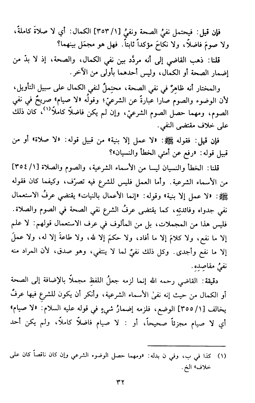 قلنا ذهب القاضي إلى أنه مردد بين نفي الكمال والصحة إذ لا بد من إضمار الصحة أو الكمال وليس أحدهما بأولى من الآخر