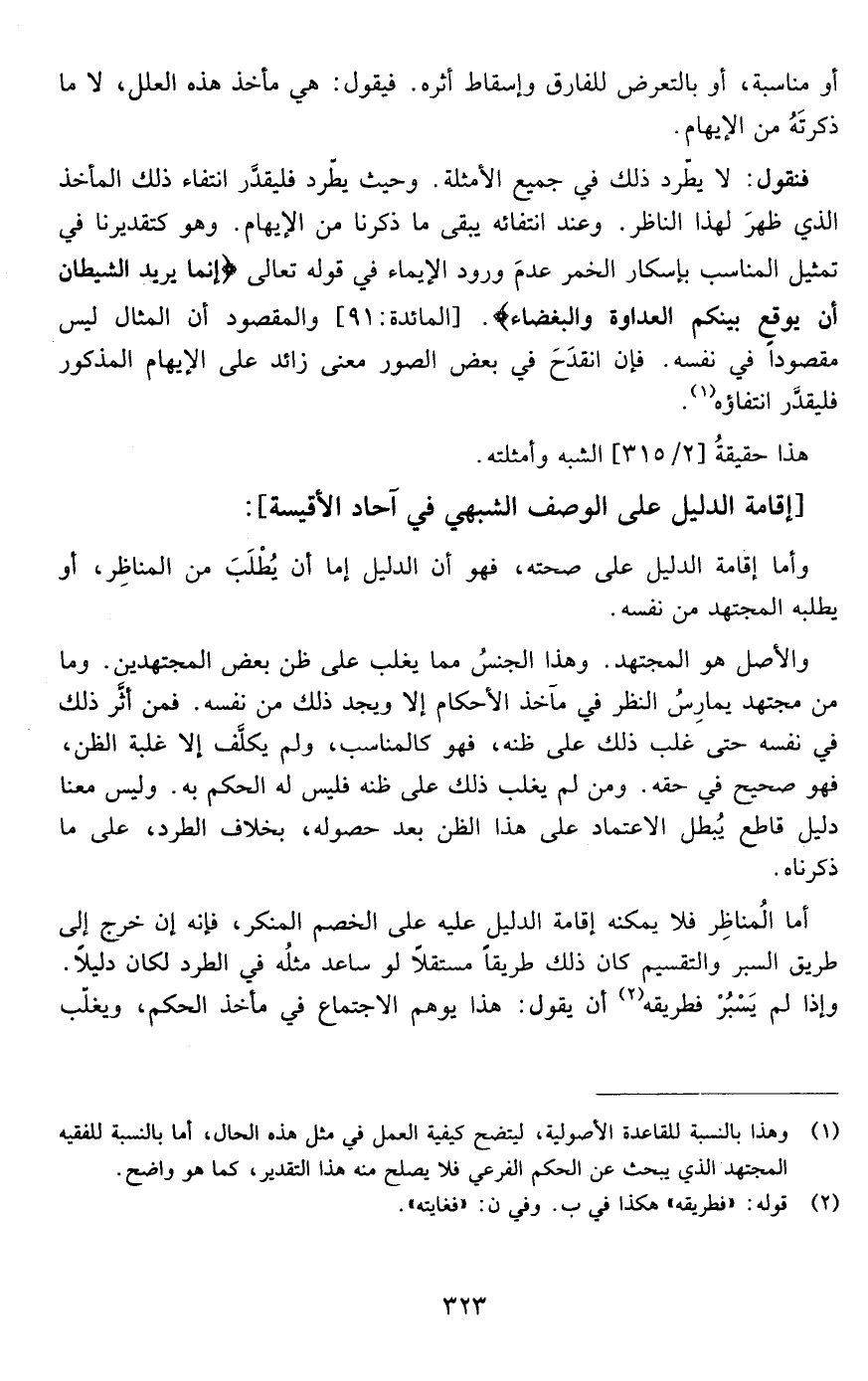 فنقول:لا يطرد ذلك في جميع الأمثلة وحيث يطرد فليقدر انتفاء ذلك المأخذ الذي ظهر لهذا الناظر وعند انتفائه يبقى ما ذكرناه من الإيهام وهو كتقديرنا في تمثيل المناسب بإسكار الخمر عدم ورود الإيماء في قوله تعالى {إِنَّمَا يُرِيدُ الشَّيْطَانُ أَنْ يُوقِعَ بَيْنَكُمُ الْعَدَاوَةَ وَالْبَغْضَاءَ} [المائدة: من الآية91] والمقصود أن المثال ليس مقصودا في نفسه فإن انقدح في بعض الصور معنى زائد على الإيهام المذكور فليقدر انتفاؤه
