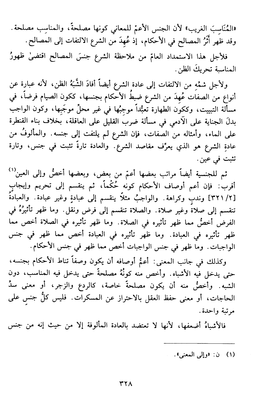 ثم للجنسية أيضا مراتب بعضها أعم من بعض وبعضها أخص وإلى العين أقرب فإن أعم أوصاف الأحكام كونه حكما ثم تنقسم إلى تحريم وإيجاب وندب وكراهة والواجب مثلا ينقسم إلى عبادة وغير عبادة والعبادة تنقسم إلى صلاة وغير صلاة والصلاة تنقسم إلى فرض ونفل وما ظهر تأثيره في الفرض أخص مما ظهر تأثيره في الصلاة وما ظهر تأثيره في الصلاة أخص مما ظهر تأثيره في العبادة وما ظهر تأثيره في العبادة أخص مما ظهر في جنس الواجبات وما ظهر في جنس الواجبات أخص مما ظهر في جنس الأحكام وكذلك في جانب المعنى أعم أوصافه أن يكون وصفا تناط الأحكام بجنسه حتى يدخل فيه الأشباه وأخص منه كونه مصلحة حتى يدخل فيه المناسب دون الشبه وأخص منه أن يكون مصلحة خاصة كالردع والزجر أو معنى سد الحاجات أو معنى حفظ العقل بالإحتراز عن المسكوات فليس كل جنس على مرتبة واحدة