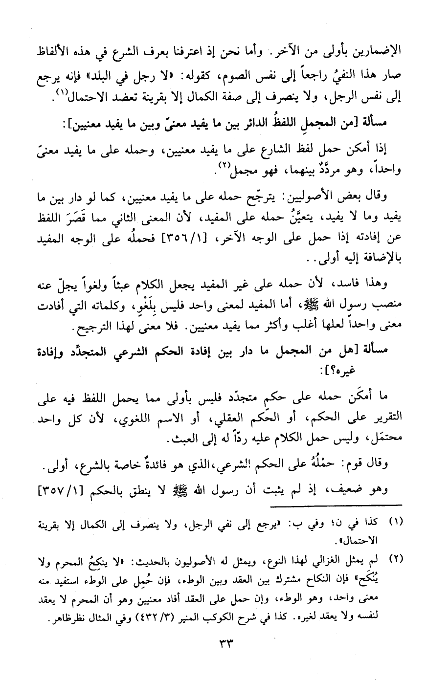 وهذا فاسد لأن حمله على غير المفيد يجعل الكلام عبثا ولغوا يجل عنه منصب رسول الله صلى الله عليه وسلم أما المفيد لمعنى واحد فليس بلغو وكلماته التي أفادت معنى واحدا لعلها أغلب وأكثر مما يفيد معنيين فلا معنى لهذا الترجيح