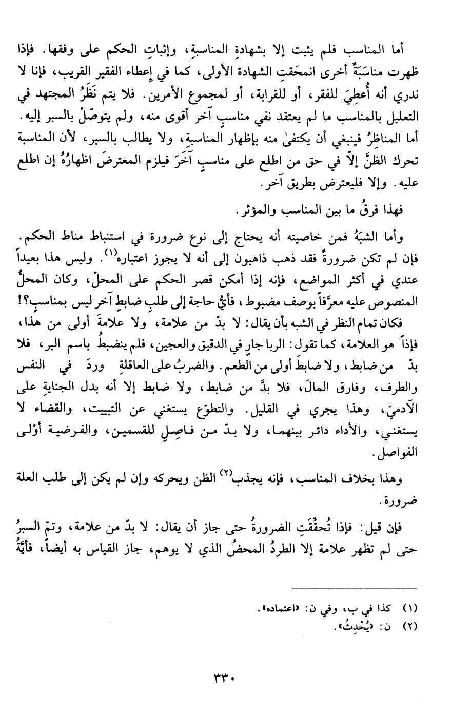 وأما الشبه فمن خاصيته أنه يحتاج إلى نوع ضرورة في استنباط مناط الحكم فإن لم تكن ضرورة فقد ذهب ذاهبوان إلى أنه لا يجوز اعتباره وليس هذا بعيدا عندي في أكثر المواضع فإنه إذا أمكن قصر الحكم على المحل وكان المحل المنصوص عليه معرفا بوصف مضبوط فأي حاجة إلى طلب ضابط آخر ليس بمناسب فكان تمام النظر في الشبه بأن يقال لا بد من علامة ولا علامة أولى من هذا فإذا هو العلامة كما تقول الربا جار في الدقيق والعجين فلم ينضبط باسم البر فلا بد من ضابط ولا ضابط أولى من الطعم والضرب على العاقلة ورد في النفس والطرف وفارق المال فلا بد من ضابط ولا ضابط إلا أنه بدل الجناية على الآدمي وهذا يجري في القليل والتطوع يستغني عن التبييت والقضاء لا يستغنى والأداء دائر بينهما ولا بد من فاصل للقسمين والفرضية أولى الفواصل