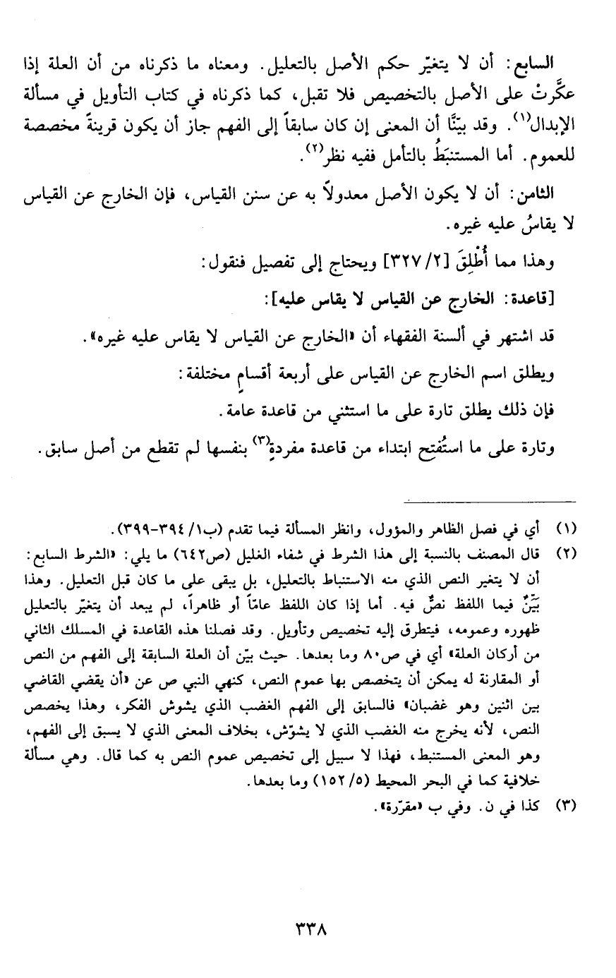 السابع: أن لا يتغير حكم الأصل بالتعليل ومعناه ما ذكرناه من أن العلة إذا عكرت على الأصل بالتخصيص فلا تقبل كما ذكرناه في كتاب التأويل في مسألة الأبدال وقد بينا أن المعنى إن كان سابقا إلى الفهم جاز أن يكون قرينة مخصصة للعموم أما المستنبط بالتأمل ففيه نظر