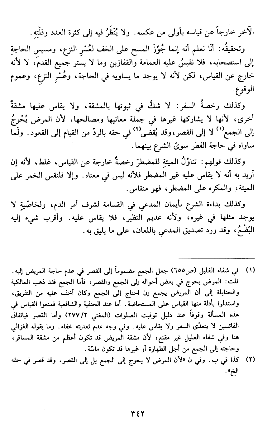 وكذلك رخصة السفر: لا شك في ثبوتها بالمشقة ولا يقاس عليها مشقة أخرى لأنها لا يشاركها غيرها في جملة معانيها ومصالحها لأن المرض يحوج إلى الجمع لا إلى القصر وقد يقضي في حقه بالرد من القيام إلى القعود ولما ساواه في حاجة الفطر سوى الشرع بينهما