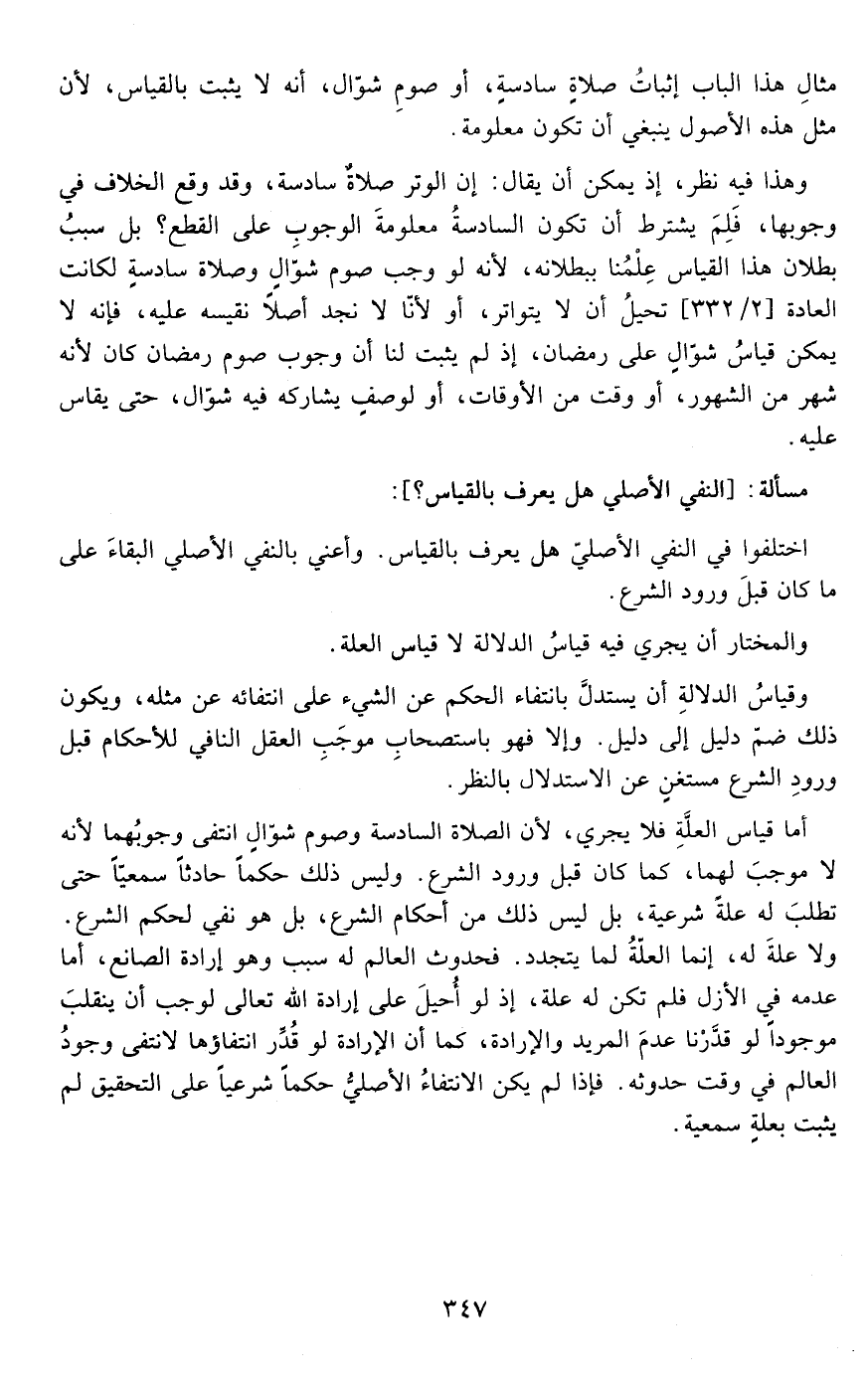 أما قياس العلة فلا يجري لأن الصلاة السادسة وصوم شوال انتفى وجوبهما لأنه لا موجب لهما كما كان قبل ورود الشرع وليس ذلك حكما حادثا سمعيا حتى تطلب له علة شرعية بل ليس ذلك من أحكام الشرع بل هو نفي لحكم الشرع ولا علة له إنما العلة لما يتجدد فحدوث العالم له سبب وهو إرادة الصانع أما عدمه في الأزل فلم تكن له علة إذ لو أحيل على إرادة الله تعالى لوجب أن ينقلب موجودا لو قدرنا عدم المريد والإرادة كما أن الإرادة لو قدر انتفاؤها لانتفى وجود العالم في وقت حدوثه فإذا لم يكن الانتفاء الأصلي حكما شرعيا على لتحقيق لم يثبت بعلة سمعية