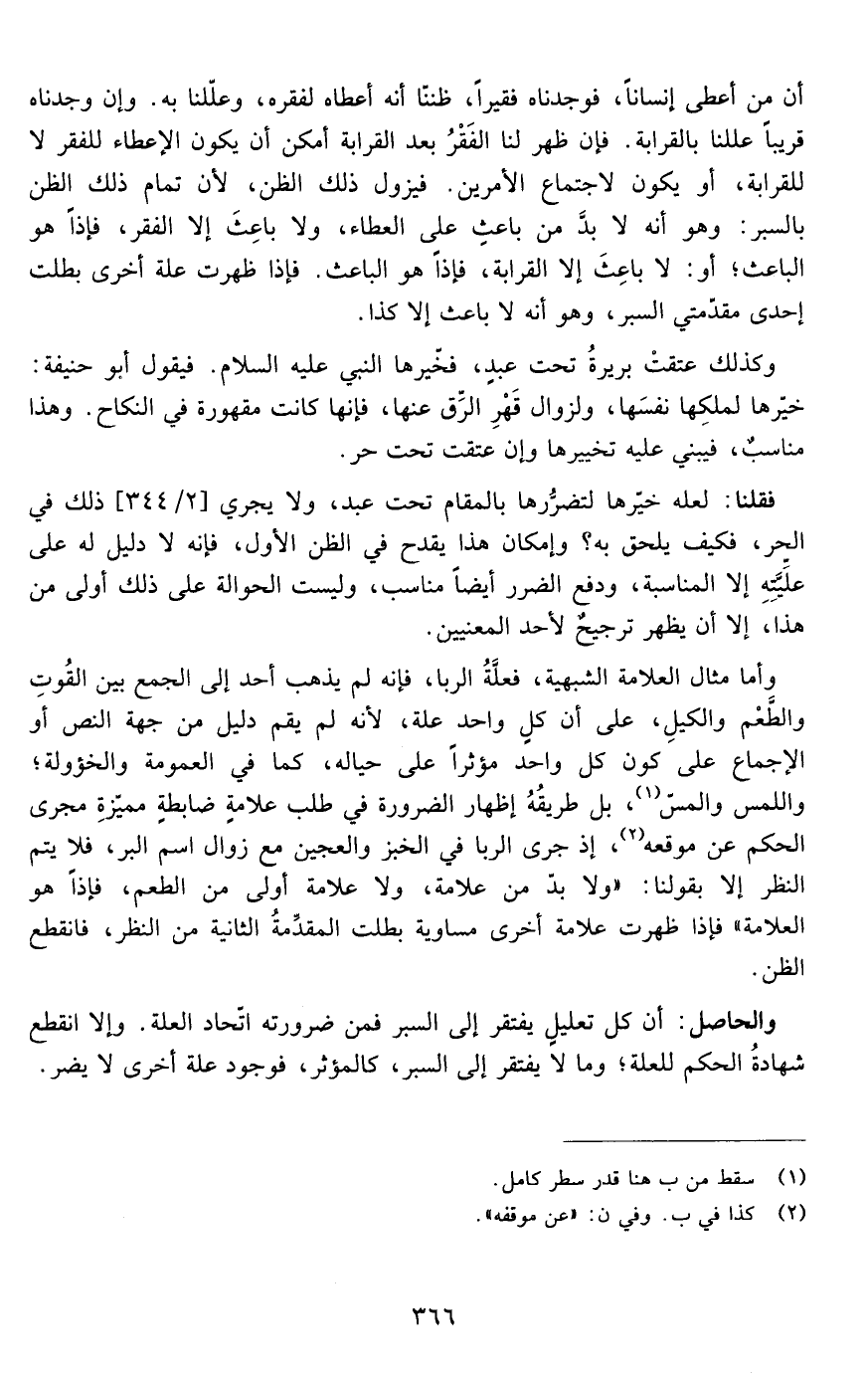 وأما مثال العلامة الشبهية فعلة الربا فإنه لم يذهب أحد إلى الجمع بين القوت والطعم والكيل على أن كل واحد علة لأنه لم يقم دليل من جهة النص والاجماع بل طريقة إظهار الضرورة في طلب علامة ضابطة مميزة مجرى الحكم عن موقعه إذ جرى الربا في الخبز والعجين مع زوال اسم البر فلا يتم النظر إلا بقولنا ولا بد من علامة ولا علامة أولى من الطعم فإذا هو العلامة فإذا ظهرت علامة أخرى مساوية بطلت المقدمة الثانية من النظر فانقطع الظن