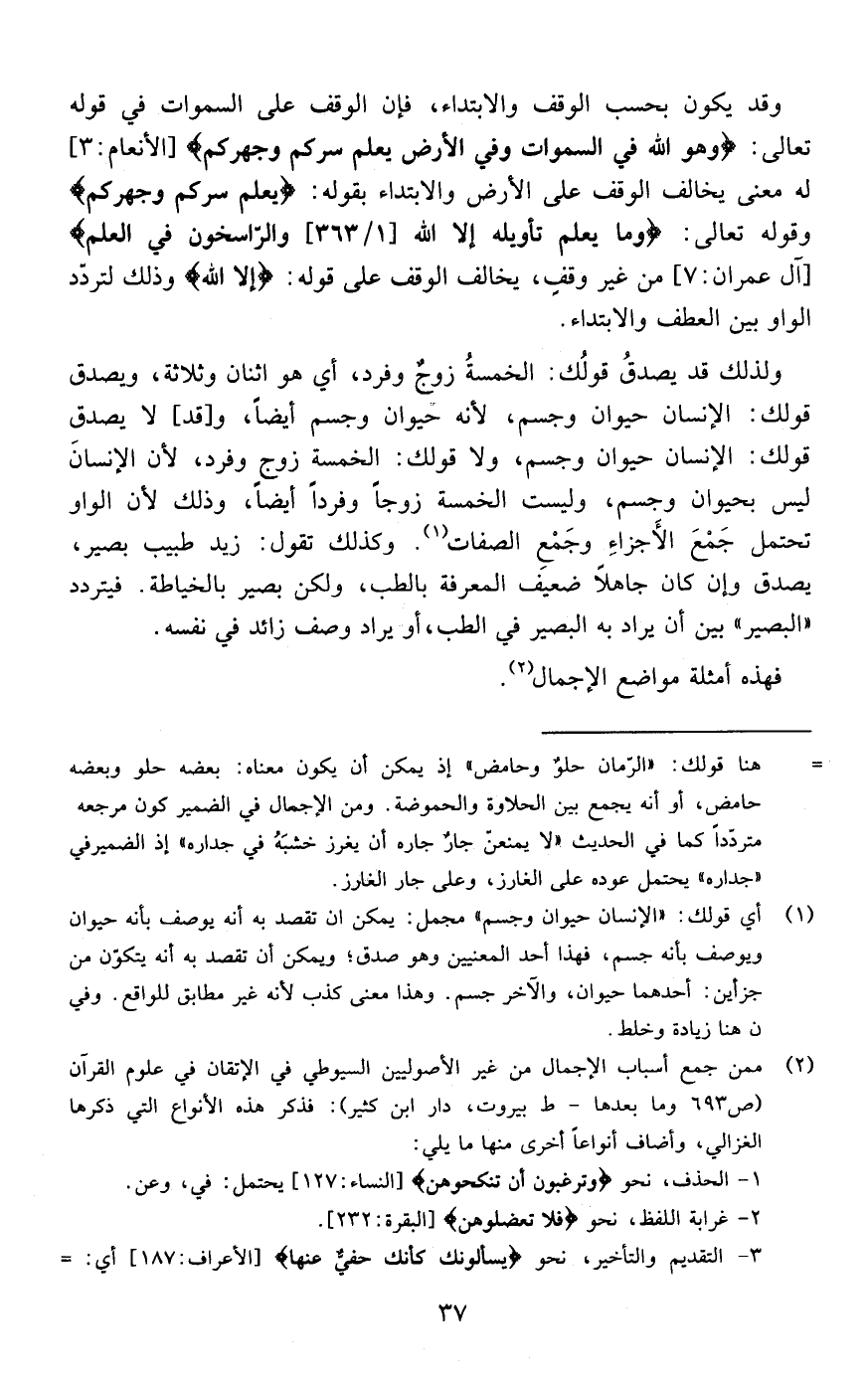 وقد يكون بحسب الوقف والابتداء فإن الوقف على السموات في قوله تعالى: {وَهُوَ اللَّهُ فِي السَّمَاوَاتِ وَفِي الأَرْضِ يَعْلَمُ سِرَّكُمْ وَجَهْرَكُمْ } [الأنعام:3] له معنى يخالف الوقف على الأرض والابتداء بقوله { سِرَّكُمْ وَجَهْرَكُمْ } [الأنعام:3] وقوله تعالى {وَمَا يَعْلَمُ تَأْوِيلَهُ إِلاَّ اللَّهُ وَالرَّاسِخُونَ فِي الْعِلْمِ} [آل عمران: من الآية7] من غير وقف يخالف الوقف على قوله {إِلاَّ اللَّهُ} وذلك لتردد الواو بين العطف والابتداء