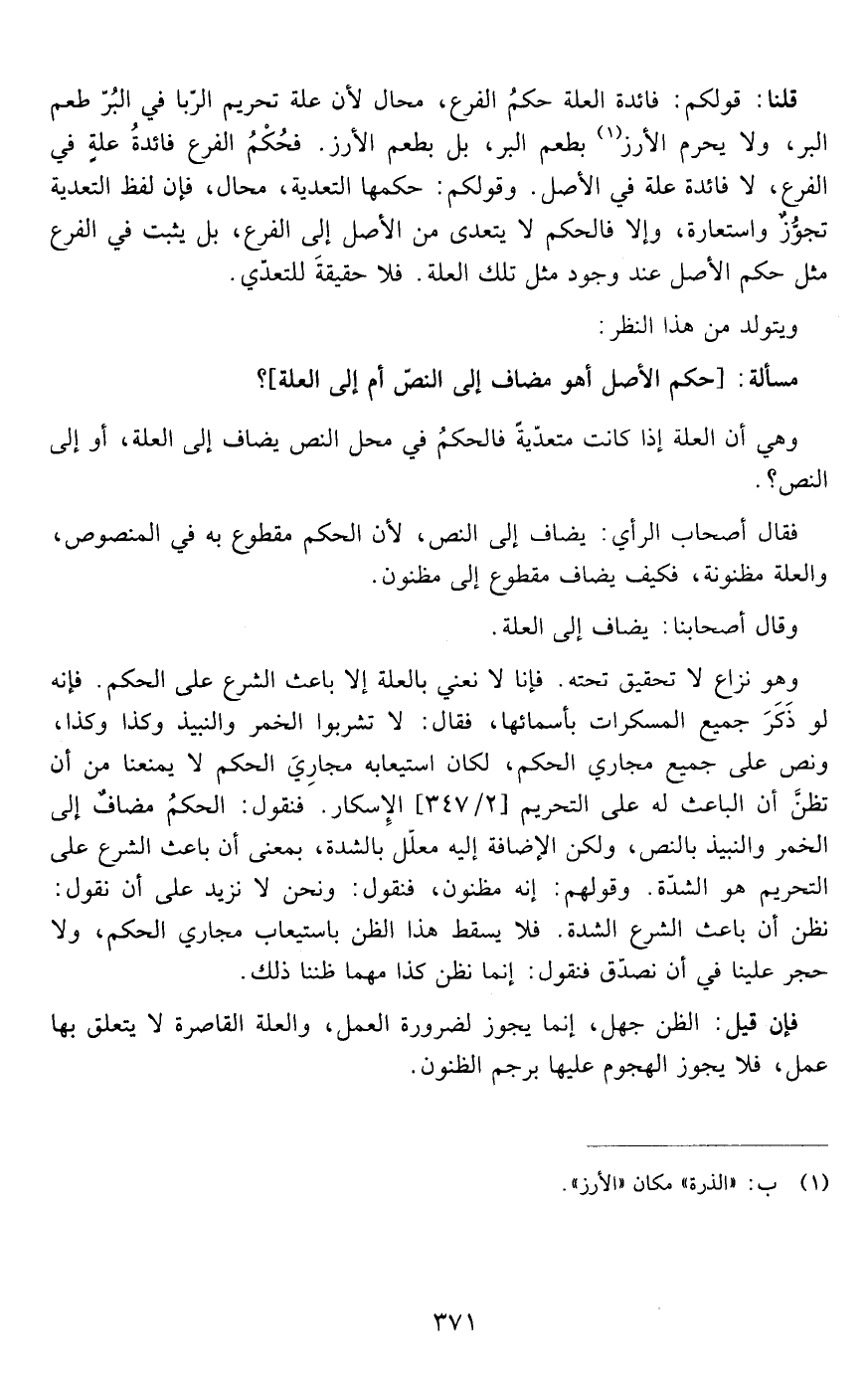 قلنا: قولكم فائدة العلة حكم الفرع محال لأن علة تحريم الربا في البر طعم البر ولا تحرم الذرة بطعم البر بل بطعم الذرة فحكم الفرع فائدة علة في الفرع لا فائدة علة في الأصل وقولكم حكمها التعدية محال فإن لفظ التعية تجوز واستعارة وإلا فالحكم لا يتعدى من الأصل إلى الفرع بل يثبت في الفرع مثل حكم الأصل عند وجود مثل تلك العلة فلا حقيقة للتعدي .