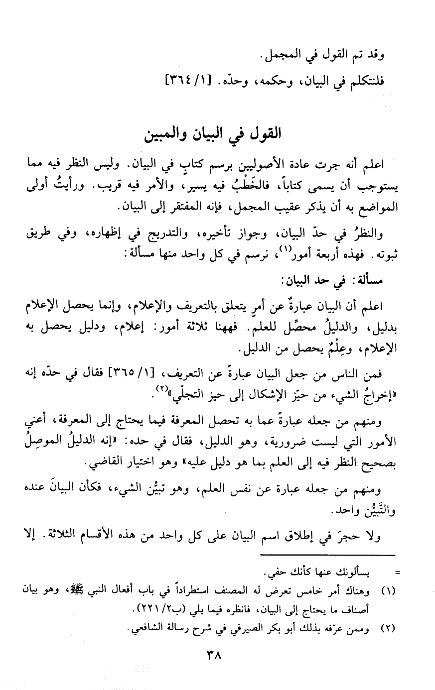 إعلم أنه جرت عادة الأصوليين برسم كتاب في البيان وليس النظر فيه مما يستوجب أن يسمى كتابا فالخطب فيه يسير والأمر فيه قريب ورأيت أولى المواضع به أن يذكر عقيب المجمل فإنه المفتقر إلى البيان والنظر فيه حد البيان وجواز تأخيره والتدريج في إظهاره وفي طريق ثبوته فهذه أربعة أمور نرسم في كل واحد منها مسألة