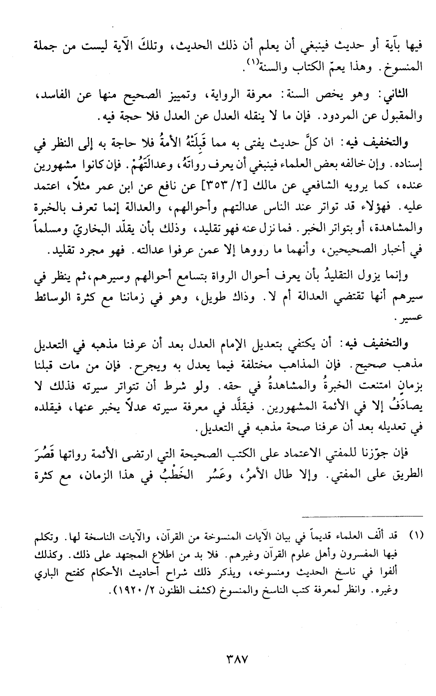 والتخفيف فيه: أن كل حديث يفتى به مما قبلته الأمة فلا حاجة به إلى النظر في إسناده وإن خالفه بعض العلماء فينبغي أن يعرف رواته وعدالتهم فإن كانوا مشهورين عنده كما يرويه الشافعي عن مالك عن نافع عن ابن عمر مثلا اعتمد عليه فهؤلاء قد تواتر عند الناس عدالتهم وأحوالهم والعدالة إنما تعرف بالخبرة والمشاهدة أو بتواتر الخبر فمانزل عنه فهو تقليد وذلك بأن يقلد البخاري ومسلما في أخبار الصحيحين وإنهما ما رووها إلا عمن عرفوا عدالته فهذا مجرد تقليد