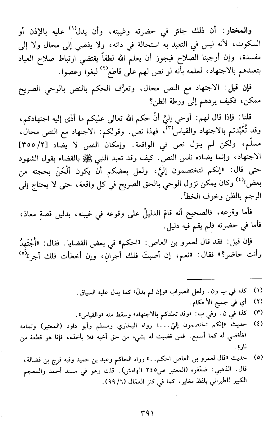 والمختار: أن ذلك جائز في حضرته وغيبته وأن يدل عليه بالأذن أو السكوت لأنه ليس في التعبد به استحالة في ذاته ولا يفضي إلى محال ولا إلى مفسدة وإن أوجبنا الصلاح فيجوز أن يعلم الله لطفا يقتضي ارتباط صلاح العباد بتعبدهم بالاجتهاد لعلمه بأنه لو نص لهم على قاطع لبغوا وعصوا