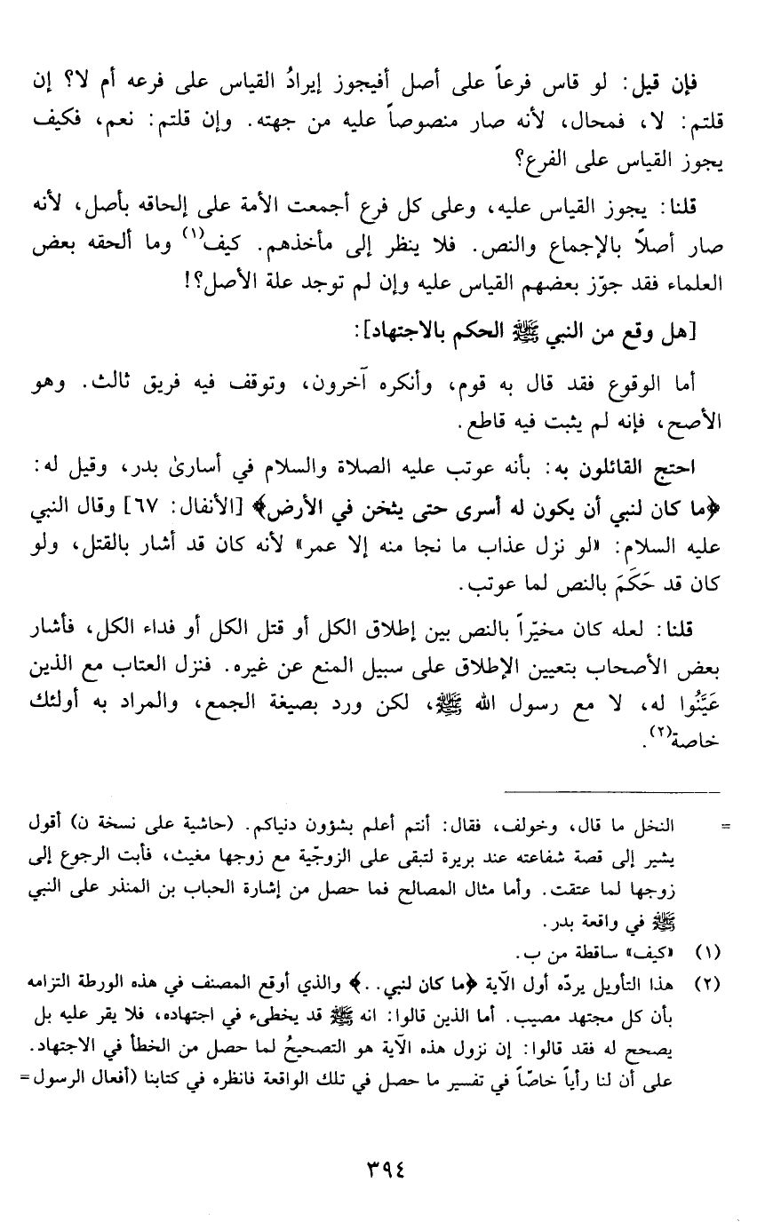 احتج القائلون به: بأنه عوتب عليه الصلاة والسلام في أسارى بدر وقيل {مَا كَانَ لِنَبِيٍّ أَنْ يَكُونَ لَهُ أَسْرَى حَتَّى يُثْخِنَ فِي الأَرْضِ} [لأنفال: من الآية67] وقال النبي عليه السلام "ولو نزل عذاب ما نجا منه إلا عمر" لأنه كان قد أشار بالقتل ولو كان قد حكم بالنص لما عوتب