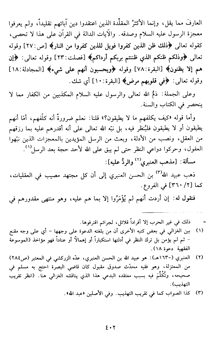 وأما قوله "كيف يكلفهم ما لا يطيقون" قلنا: نعلم ضرورة أنه كلفهم أما أنهم يطيقون أو لا يطيقون فلننظر فيه بل نيه الله تعالى على أنه أقدرهم عليه بما رزقهم من العقل ونصب من الأدلة وبعث من الرسل
