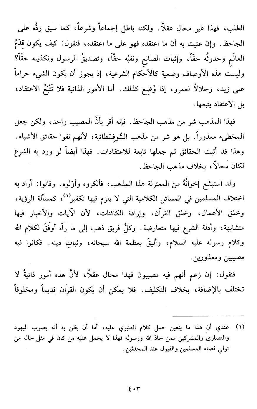 فهذا المذهب شر من مذهب الجاحظ فإنه أقر بأن المصيب واحد ولكن جعل المخطىء معذورا بل هو شر من مذهب السوفسطائية لأنهم نفوا حقائق الأشياء وهذا قد أثبت الحقائق ثم جعلها تابعة للاعتقادات فهذا أيضا لو ورد بهالشرع لكان محالا بخلاف مذهب الجاحظ