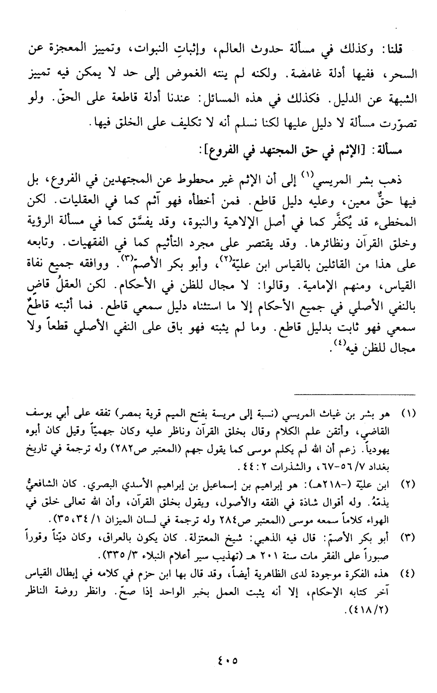 ذهب بشر المريسي إلى أن الإثم غير محطوط عن المجتهدين في الفروع بل فيها حق معين وعليه دليل قاطع فمن أخطأه فهو آثم كما في العقليات لكن المخطىء قد يكفر كما في أصل الإلهية والنبوة وقد يفسق كما في مسألة الرؤية وخلق القرآن ونظائرها وقد يقتصر على مجرد التأثيم كما في الفقهيات وتابعه على هذا من القائلين بالقياس ابن علية وأبو بكر الأصم ووافقه جميع نفاة القياس ومنهم الإمامية وقالوا لا مجال للظن في الأحكام لكن العقل قاض بالنفي الأصلي في جميع الأحكام إلا ما استثناه دليل سمعي قاطع فما أثبته قاطع سمعي فهو ثابت بدليل قاطع وما لم يثبته فهو باق على النفي الأصلي قطعا ولا مجال للظن فيه