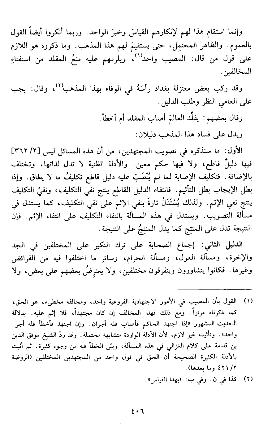 الأول: ما سنذكره في تصويب المجتهدين ونبين أن هذه المسائل ليس فيها دليل قاطع ولا فيها حكم معين والأدلة الظنية لا تدل لذاتها وتختلف بالإضافة فتكليف الإصابة لما لم ينصب عليه دليل قاطع تكليف ما لا يطاق وإذا بطل الإيجاب بطل التأثيم فانتفاء الدليل القاطع ينتج نفي التكليف ينتج نفي الإثم ولذلك يستدل تارة بنفي الإثم على نفي التكليف كما يستدل في مسألة التصويب ويستدل في هذه المسألة بانتفاء التكليف على انتفاء الإثم فإن النتيجة تدل على المنتج كما يدل المنتج على النتيجة