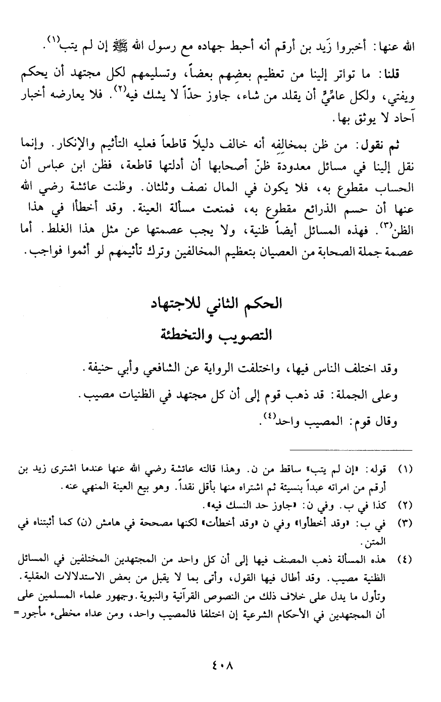 ثم نقول: من ظن بمخالفه أنه خالف دليلا قاطعا فعليه التأثيم والإنكار وإنما نقل إلينا في مسائل معدودة ظن أصحابها أن أدلتها قاطعة فظن ابن عباس أن الحساب مقطوع به فلا يكون في المال نصف وثلثان وظنت عائشة رضي الله عنها أن حسم الذرائع مقطوع به فمنعت مسألة العينة وقد أخطأوا في هذا الظن فهذه المسائل أيضا ظنية ولا يجب عصمتها عن مثل هذا الغلط أما عصمة جملة الصحابة عن العصيان بتعظيم المخالفين وترك تأثيمهم لو أثموا فواجب