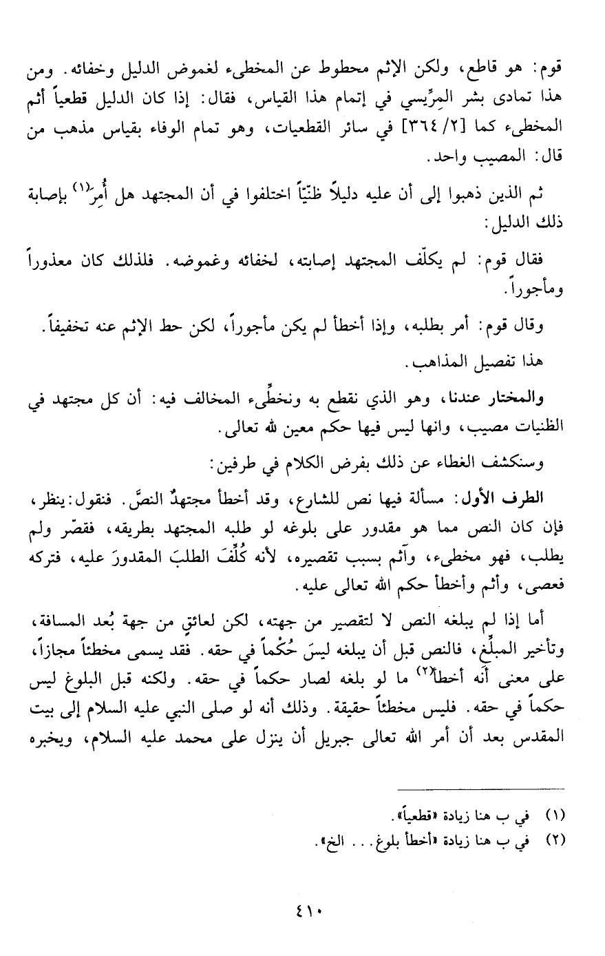 قوم: وهو قاطع ولكن الأثم محطوط عن المخطىء لغموض الدليل وخفائه ومن هذا تمادي بشر المريسي في إتمام هذا القياس فقال إذا كان الدليل قطعيا أثم المخطىء كما في سائر القطعيات وهو تمام الوفاء بقياس مذهب من قال المصيب واحد