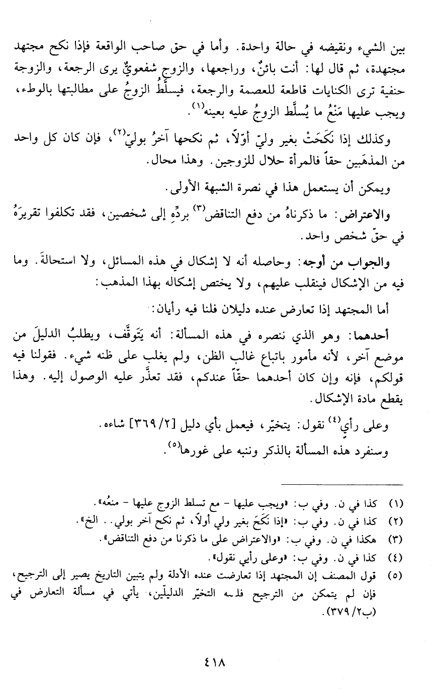 بين الشيء ونقيضه في حالة واحدة وأما في حق صاحب الواقعة فإذا نكح مجتهد مجتهدة ثم قال لها أنت بائن وراجعها والزوج شفعوي يرى الرجعة والزوجة حنفية ترى الكنايات قاطعة للعصمة والرجعة فيسلط الزوج على مطالبتها بالوطء ويجب عليها مع تسلط الزوج عليها منعه
