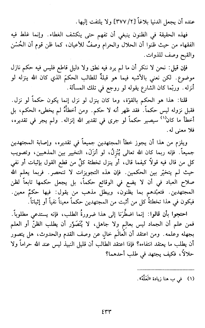 ويلزم من هذا أن يجوز خطأ المجتهدين جميعا في تقديره وإصابة المجتهدين جميعا فإنه ربما كان ينزل لو أنزل التخيير بين المذهبين وتصويب كل من قال فيه قولا كيفما قال أو ينزل تخطئة كل من قطع القول بإثبات أو نفي حيث لم يتخير بين الحكمين فإن هذه التجويزات لا تنحصر فربما يعلم الله صلاح العباد في أن لا يضع في الوقائع حكما بل يجعل حكمها تابعا لظن المجتهدين فتعبدهم بما يظنون ويبطل مذهب من يقول فيها بحكم معين فيكون في هذا تخطئة كل من أثبت من المجتهدين حكما معينا نفيا أو إثباتا