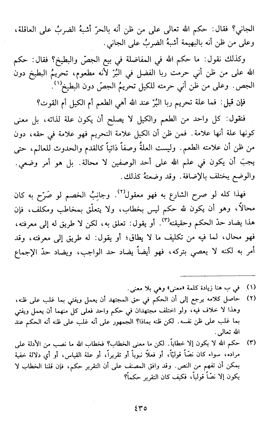 وكذلك نقول: ما حكم الله في المفاضلة في بيع الجص والبطيخ فقال حكم الله على من ظن إني حرمت ربا الفضل في البر لأنه مطعوم تحريم البطيخ دون الجص وعلى من ظن أني حرمته للكيل تحريم الجص دون البطيخ