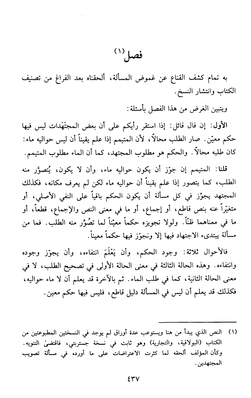 فالأحوال ثلاثة : وجود الحكم ،وأن يعلم انتفاءه ، وأن يجوز وجوده وانتفاءه وهذه. الحالة الثالثة في معنى الحالة الأولى:في تصحيح الطلب ، لا في معنى الحالة الثانية ، كما في طلب الماء . ثم بالآخرة قد يعلم أن لا ماء حواليه ، فكذلك قد يعلم أن ليس في المسألة دليل قاطع ، فليس فيها حكم معين .