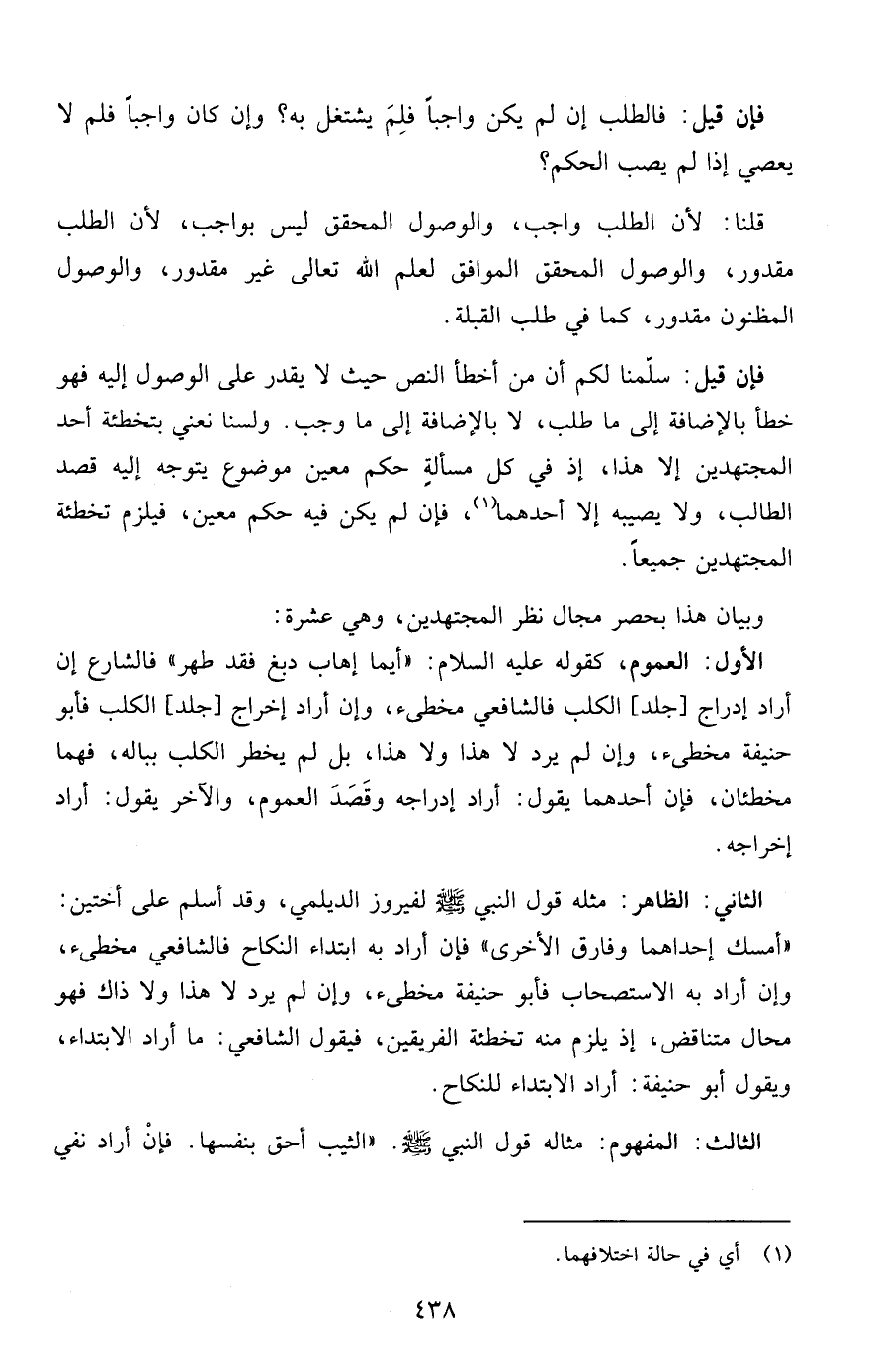 الأول: العموم ، كقوله عليه السلام : " أيما إهاب دبغ فقد طهر " فالشارع إن أراد إدارج ]جلد[ الكلب فالشافعي مخطئ ، وإن أراد إخراج ]جلد[فأبو حنيفة مخطئ ، وإن لم يرد لا هذا ولا هذا ، بل لم يخطر الكلب بباله ، فهما مخطئان ، فإن أحدهما يقول : أراد إدراجه وقصد العموم ، والآخر يقول : أراد إخراجه .
