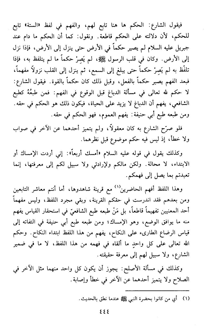 فيقول الشارع: الحكم ها هنا تابع لهم ، والفهم في الستة تابع للحكم ، لأن دلالته على الحكم قاطعة . ونقول : كما أن الحكم مادام عند جبريل عليه السلام لم يصير حكماً في الارض حتى ينزل إلى الأرض ، فإذا نزل إلى الأرض . وكان في قلب الرسول صلى الله عليه وسلم ،لم يصر حكماً مالم يتلفظ به ، فإذا نزل تلفظ به لم يصير حكماً بالفعل، وقبل ذلك كان حكما بالقوة . فيقول الشارع : لاحكم لله تعالى في مسألة الدباغ قبل الوقوع في الفهم: فمن طبعه كطبع الشافعي ، يفهم أن الدباغ لا يزيد على الحياة ، فيكون ذلك هو الحكم في حقه ومن طبعه ابي حنيفة: يفهم العموم ، فهو الحكم في حقه.