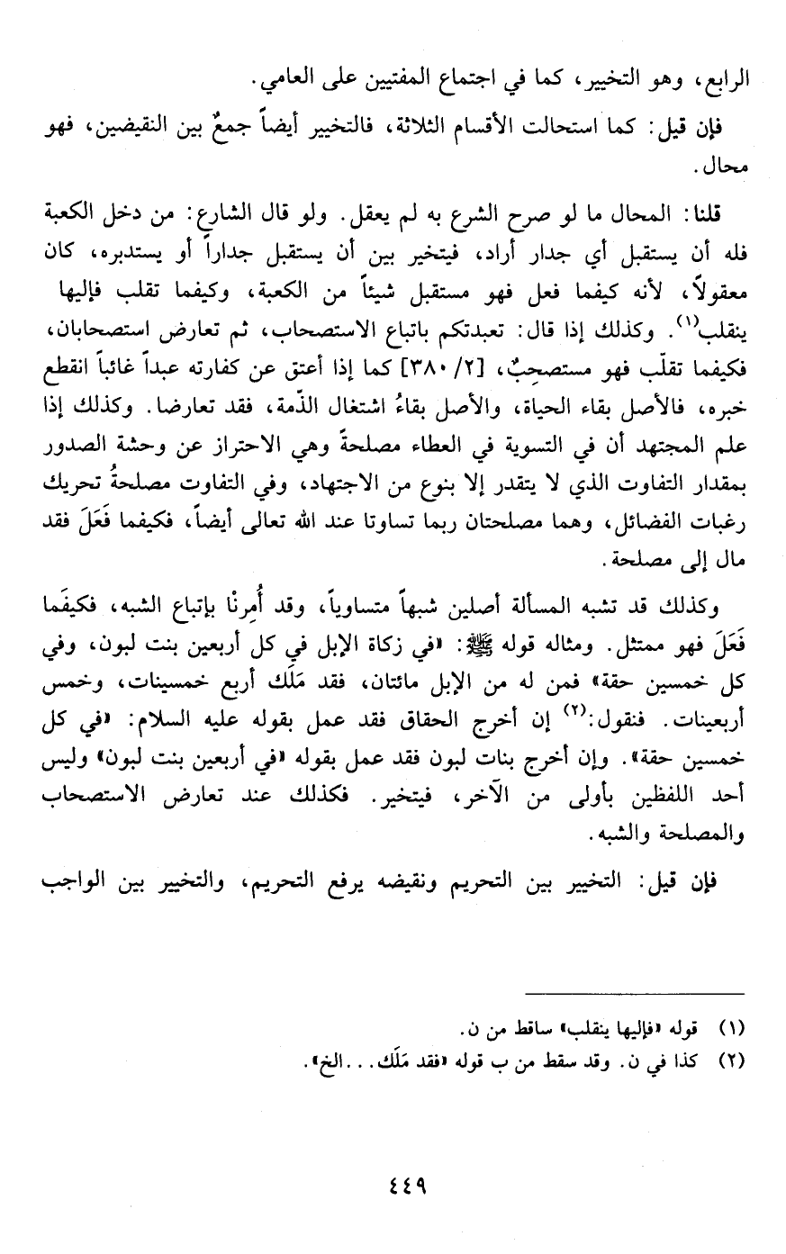 وكذلك قد تشبه المسألة أصلين شبها متساويا وقد أمرنا باتباع الشبه فكيفما فعل فهو ممتثل ومثاله قوله صلى الله عليه وسلم في زكاة الإبل: "في كل أربعين بنت لبون وفي كل خمسين حقة " فمن له من الإبل مائتان فإن أخرج الحقاق فقد عمل بقوله عليه السلام في كل خمسين حقة وإن أخرج بنات لبون فقد عمل بقوله في كل أربعين بنت لبون وليس أحد اللفظين بأولى من الآخر فيتخير فكذلك عند تعارض الاستصحاب والمصلحة والشبه