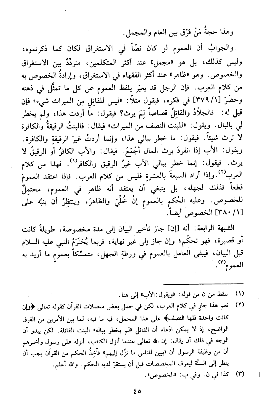 والجواب أن العموم لو كان نصا في الاستغراق لكان كما ذكرتموه وليس كذلك بل هو مجمل عند أكثر المتكلمين متردد بين الاستغراق والخصوص وهو ظاهر عند أكثر الفقهاء في الاستغراق وإرادة الخصوص به من كلام العرب فإن الرجل قد يعبر بلفظ العموم عن كل ما تمثل في ذهنه وحضر في فكره فيقول مثلا ليس للقاتل من الميراث شيء فإذا قيل له فالجلاد والقاتل قصاصا لم يرث فيقول ما أردت هذا ولم يخطر لي بالبال ويقول للبنت النصف من الميراث فيقال فالبنت الرقيقة والكافرة لا ترث شيئا فيقول ما خطر ببالي هذا وإنما أردت غير الرقيقة والكافرة ويقول الأب إذا انفرد يرث المال أجمع فيقال والأب الكافر أو الرقيق لا يرث فيقول إنما خطر ببالي الأب غير الرقيق والكافر فهذا من كلام العرب وإذا أراد السبعة بالعشرة فليس من كلام العرب فإذا اعتقد العموم قطعا فذلك لجهله بل ينبغي أن يعتقد أنه ظاهر في العموم محتمل للخصوص وعليه الحكم بالعموم إن خلي والظاهر وينتظر أن ينبه على الخصوص أيضا