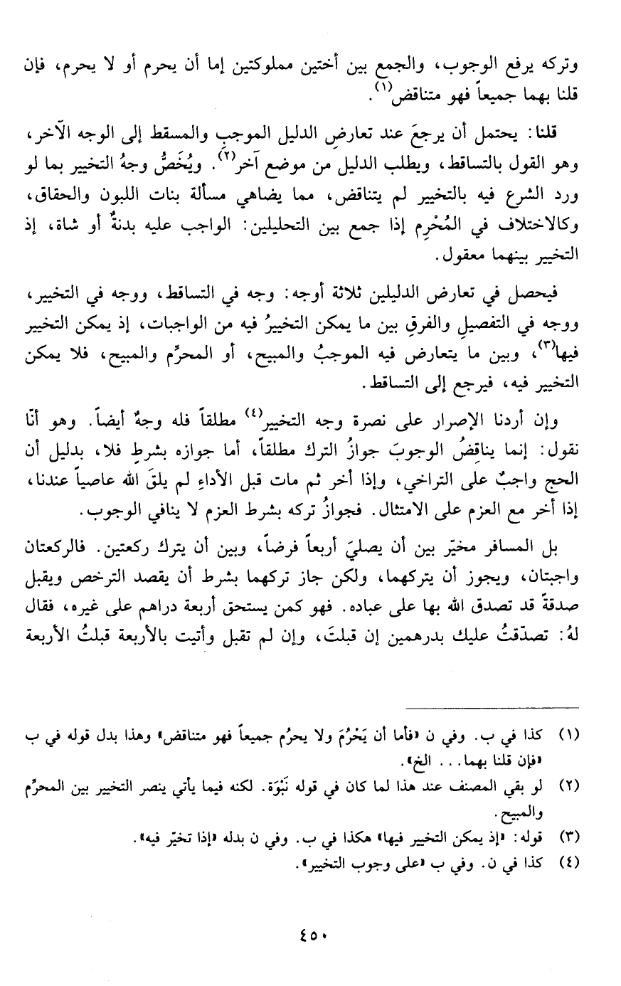 فيحصل في تعارض الدليلين ثلاثة أوجه:وجه في التساقط ووجه في التخيير ووجه في التفصيل وفصل بين ما يمكن التخيير فيه من الواجبات إذ يمكن التخيير فيها وبين ما يتعارض فيه الموجب والمبيح أو المحرم والمبيح فلا يمكن التخيير فيه فيرجع إلى التساقط