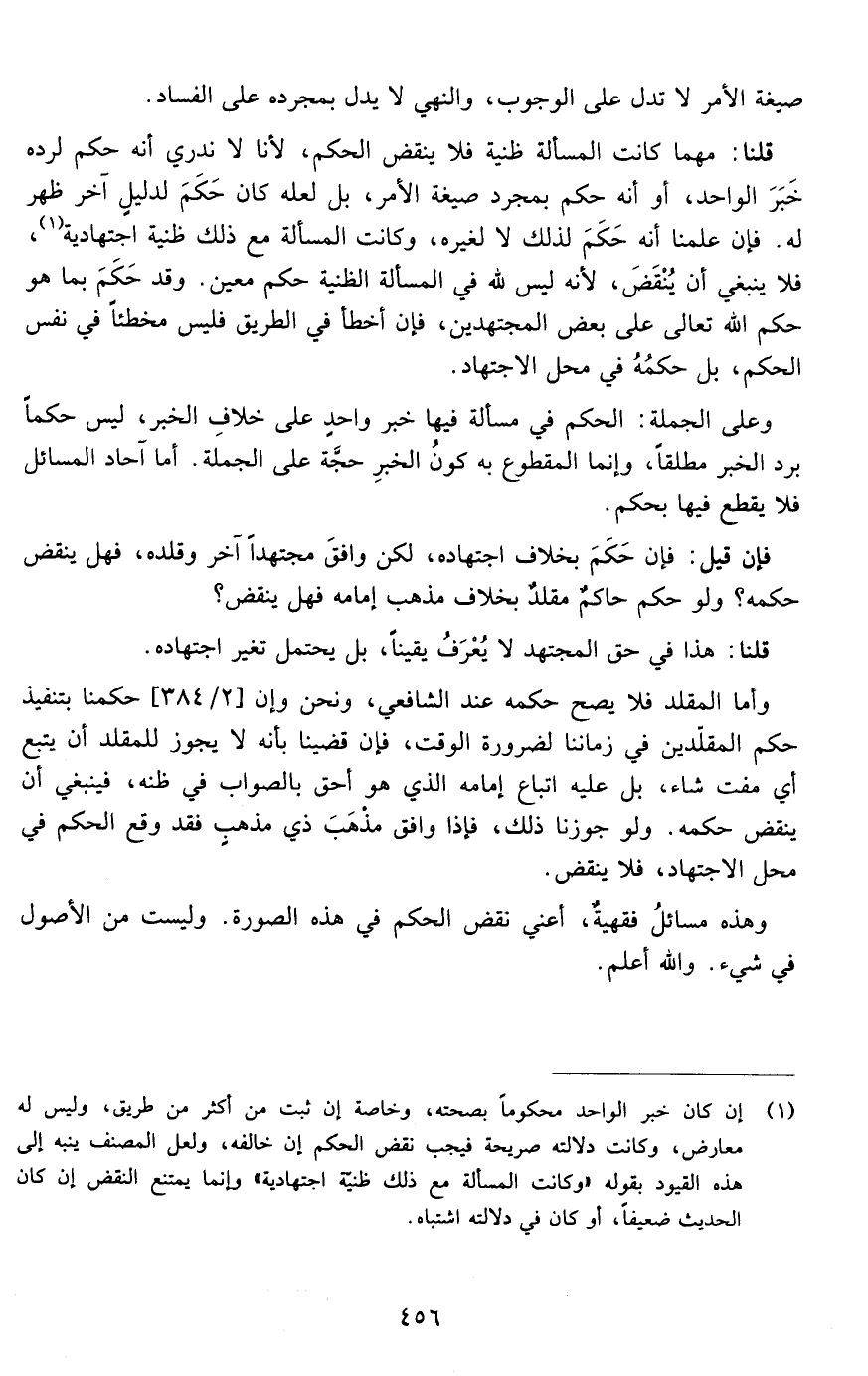 قلنا: معما كانت المسألة ظنية فلا ينقض الحكم لأنا لا ندري أنه حكم لرده خبر الواحد أو أنه حكم بمجرد صيغة الأمر بل لعله كان حكم لدليل آخر ظهر له فإن علمنا أنه حكم لذلك لا لغيره وكانت المسألة مع ذلك ظنية اجتهادية فلا ينبغي أن ينقض لأنه ليس لله في المسألة الظنية حكم معين فقد حكم بما هو حكم الله تعالى على بعض المجتهدين فإن أخطأ في الطريق فليس مخطئا في نفس الحكم بل حكم في محل الاجتهاد