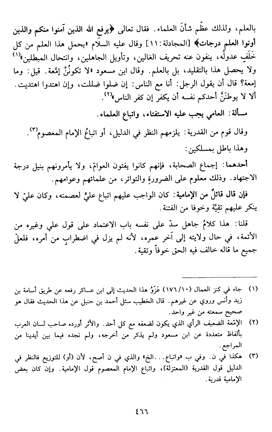 بالعلم ولذلك عظم شأن العلماء وقال تعالى {يَرْفَعِ اللَّهُ الَّذِينَ آمَنُوا مِنْكُمْ وَالَّذِينَ أُوتُوا الْعِلْمَ دَرَجَاتٍ} [المجادلة: من الآية11] وقال عليه السلام يحمل هذا العلم من كل خلف عدوله ينفون عنه تحريف الغالين وتأويل الجاهلين وانتحال المبطلين ولا يحصل هذا بالتقليد بل بالعلم وقالابن مسعود لا تكونن إمعة قيل وما إمعة قال أن يقول الرجل أنا مع الناس إن ضلوا ضللت وإن اهتدوا اهتديت ألا لا يوطنن أحدكم نفسه أن يكفر إن كفر الناس