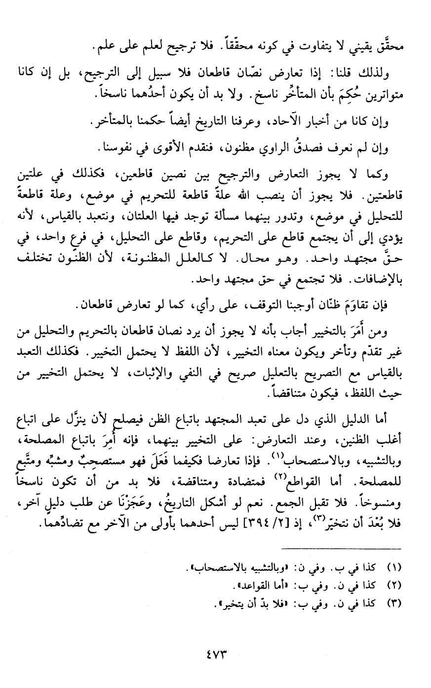 ولذلك قلنا: إذا تعارض نصان قاطعان فلا سبيل إلى الترجيح بل إن كانا متواترين حكم بأن المتأخر ناسخ ولا بد أن يكون أحدهما ناسخا