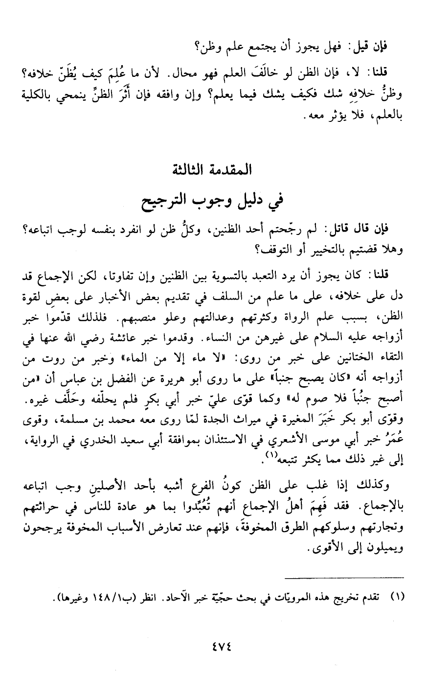 فإن قال قائل: لم رجحتم أحد الظنين وكل ظن لو انفرد بنفسه لوجب اتباعه وهلا قضيتم بالتخيير أو التوقف ؟