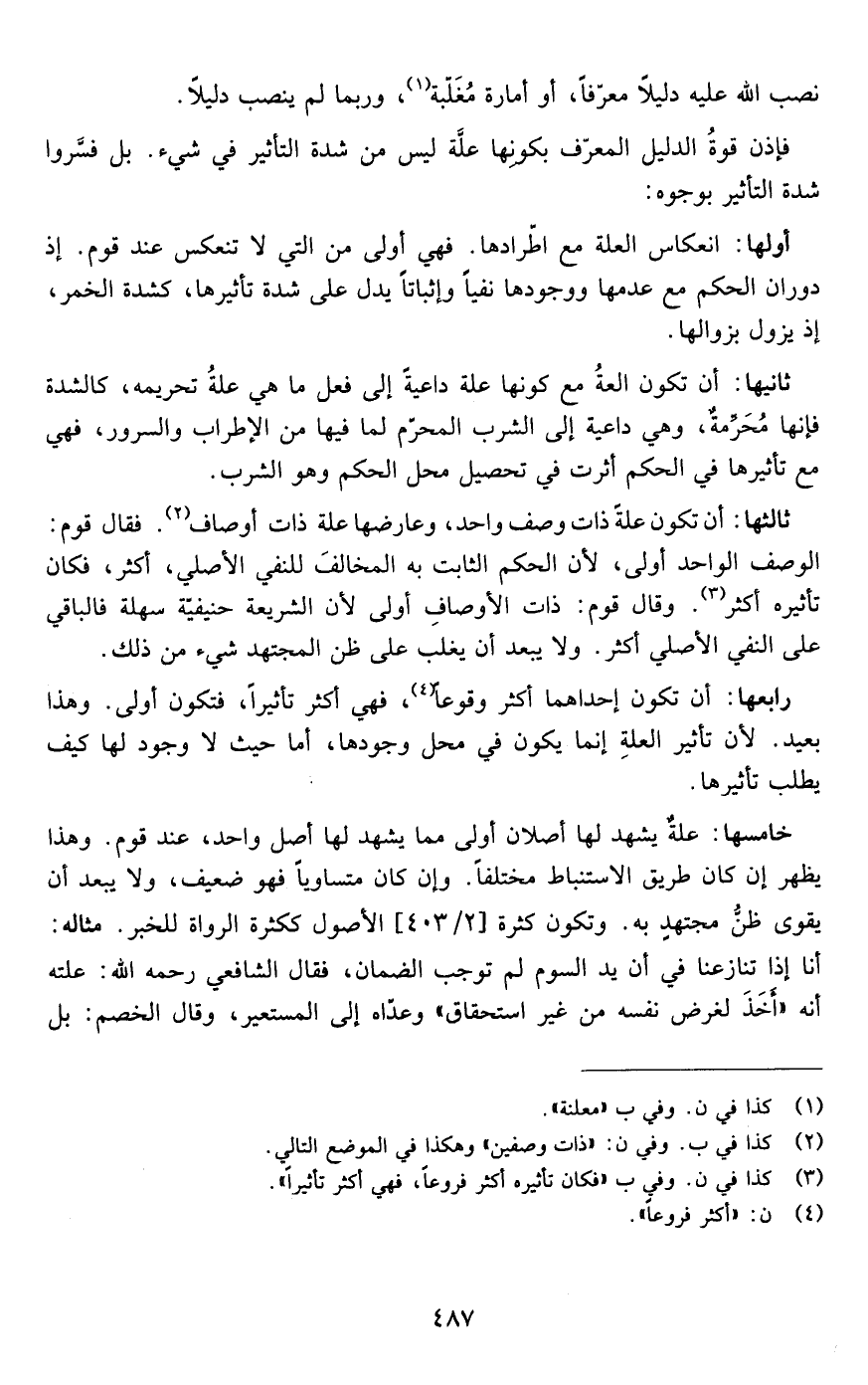 أولها: انعكاس العلة مع اطرادها فهي أولى من التي لا تنعكس عند قوم إذ دوران الحكم مع عدمها ووجودها نفيا وإثباتا يدل على شدة تأثيرها كشدة الخمر إذ يزول الحكم بزوالها