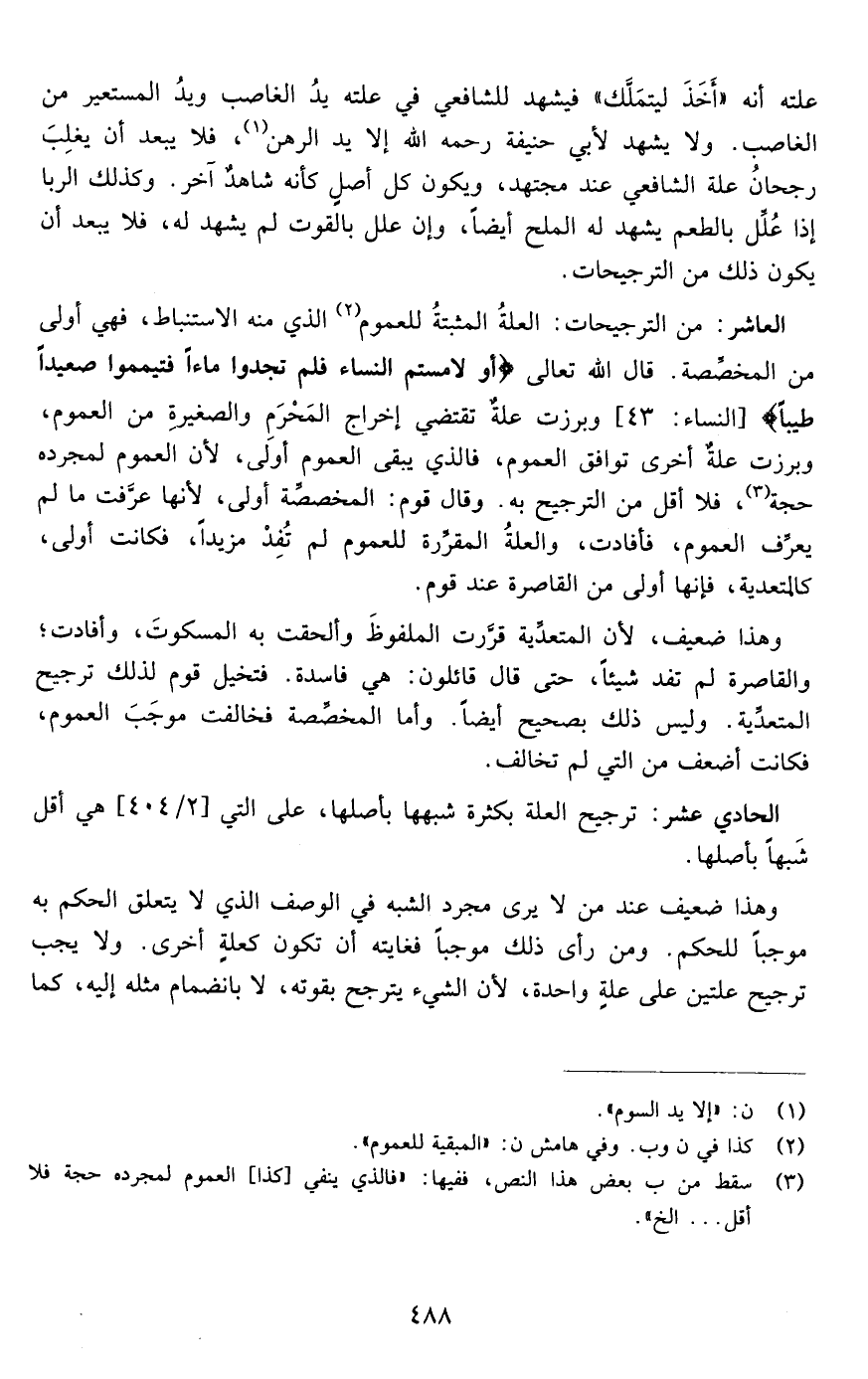 العاشر: من الترجيحات العلة المثبتة للعموم الذي منه الاستنباط فهي أولى من المخصصة قال الله تعالى {أَوْ لامَسْتُمُ النِّسَاءَ فَلَمْ تَجِدُوا مَاءً فَتَيَمَّمُوا صَعِيداً طَيِّباً} [النساء: من الآية43] فبرزت علة تقتضي إخراج المحرم والصغيرة من العموم وبرزت علة أخرى توافق العموم فالذي ينفي العموم لمجرده حجة فلا أقل من الترجيح به وقال قوم المخصصة أولى لأنها عرفت ما لم يعرف العموم فأفادت والعلة المقررة للعموم لم تفد مزيدا فكانت أولى كالمتعدية فإنها أولى من القاصرة عند قوم